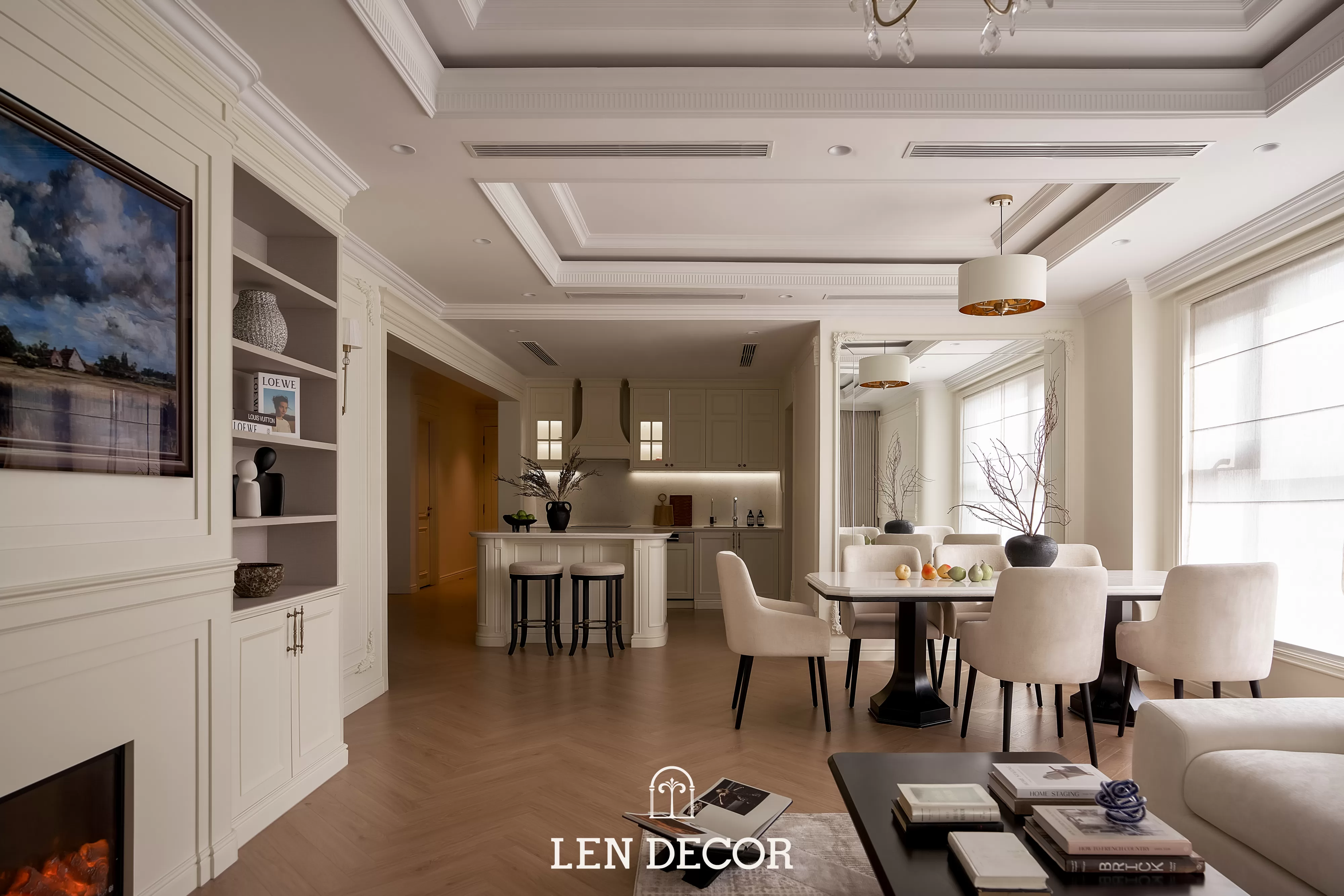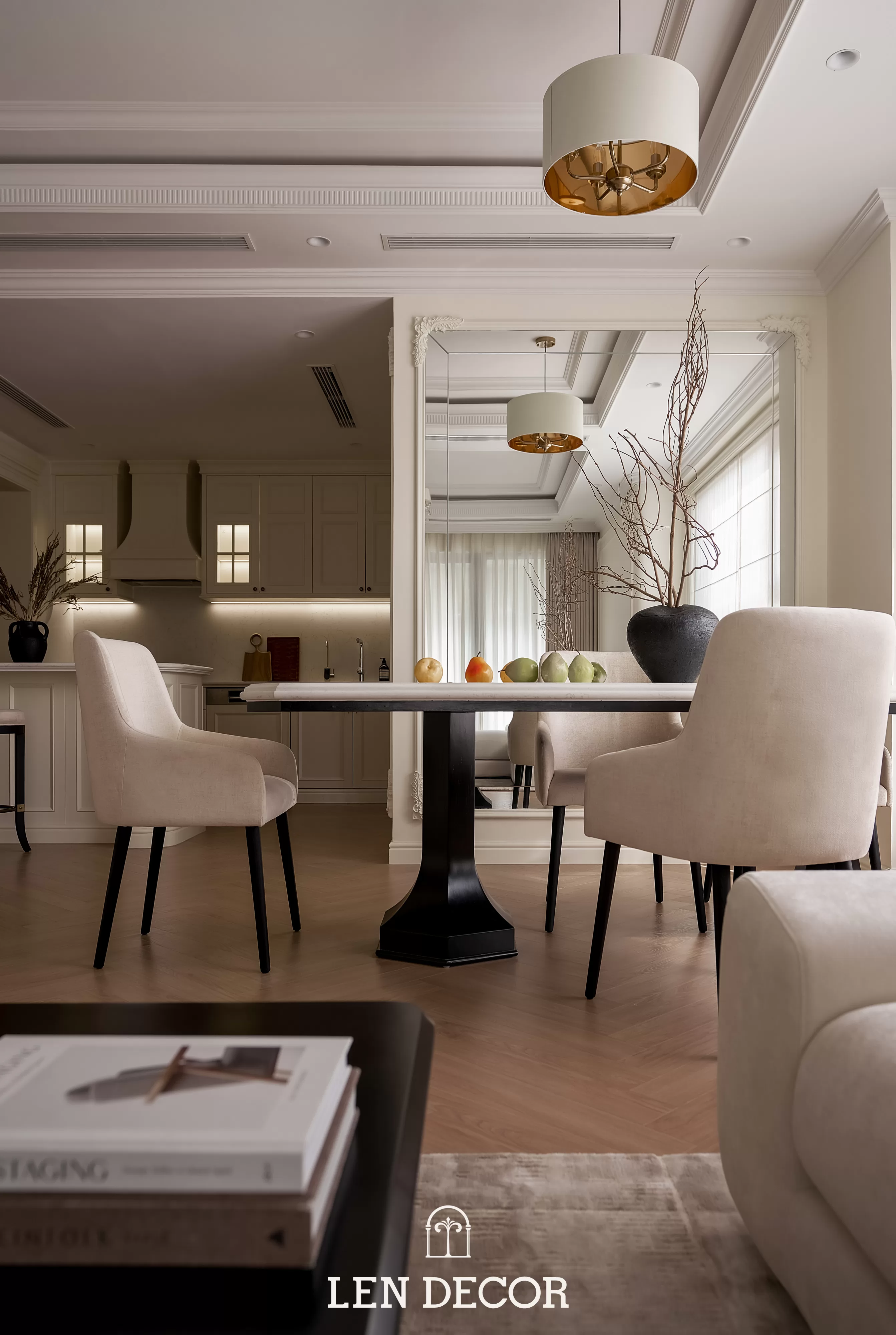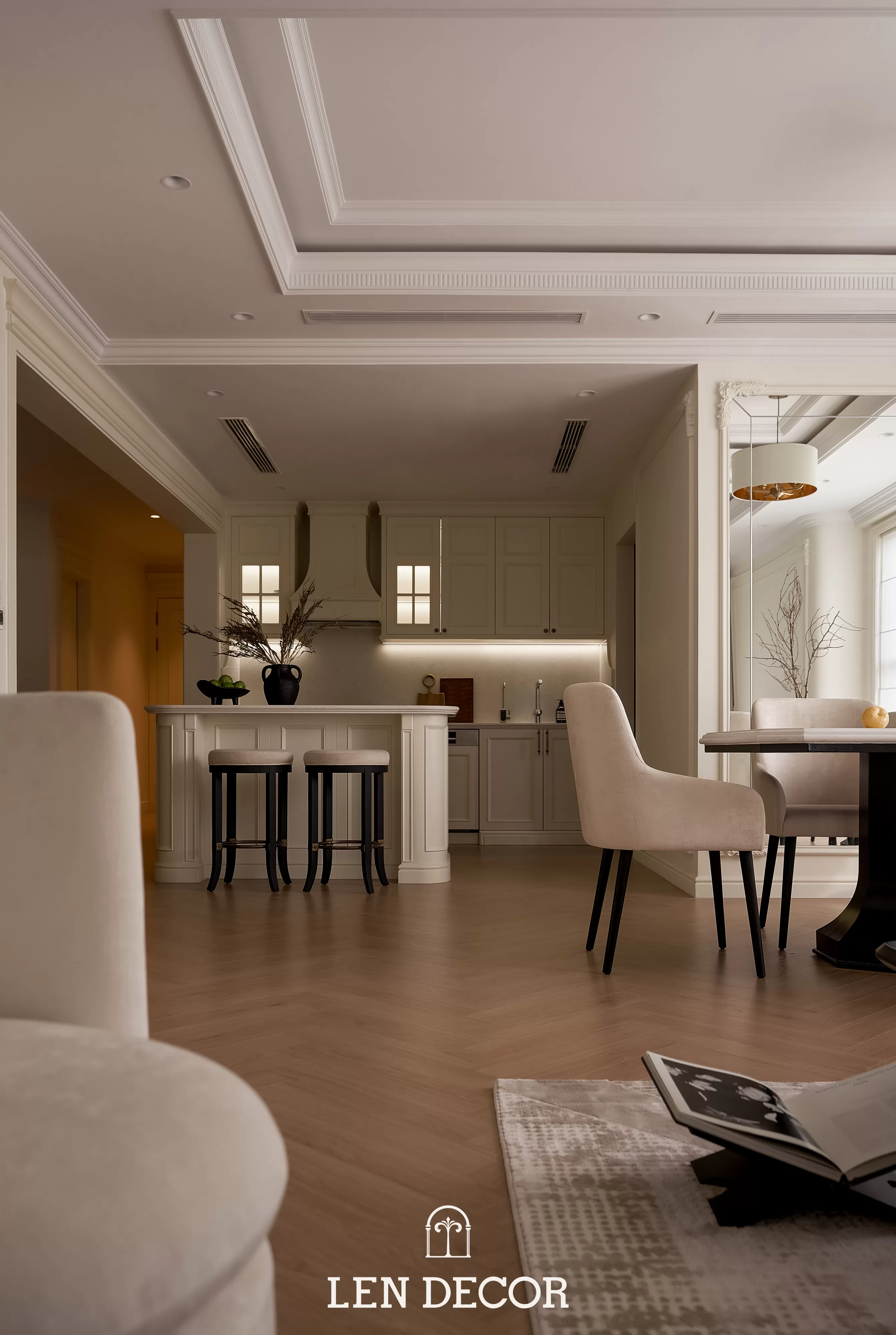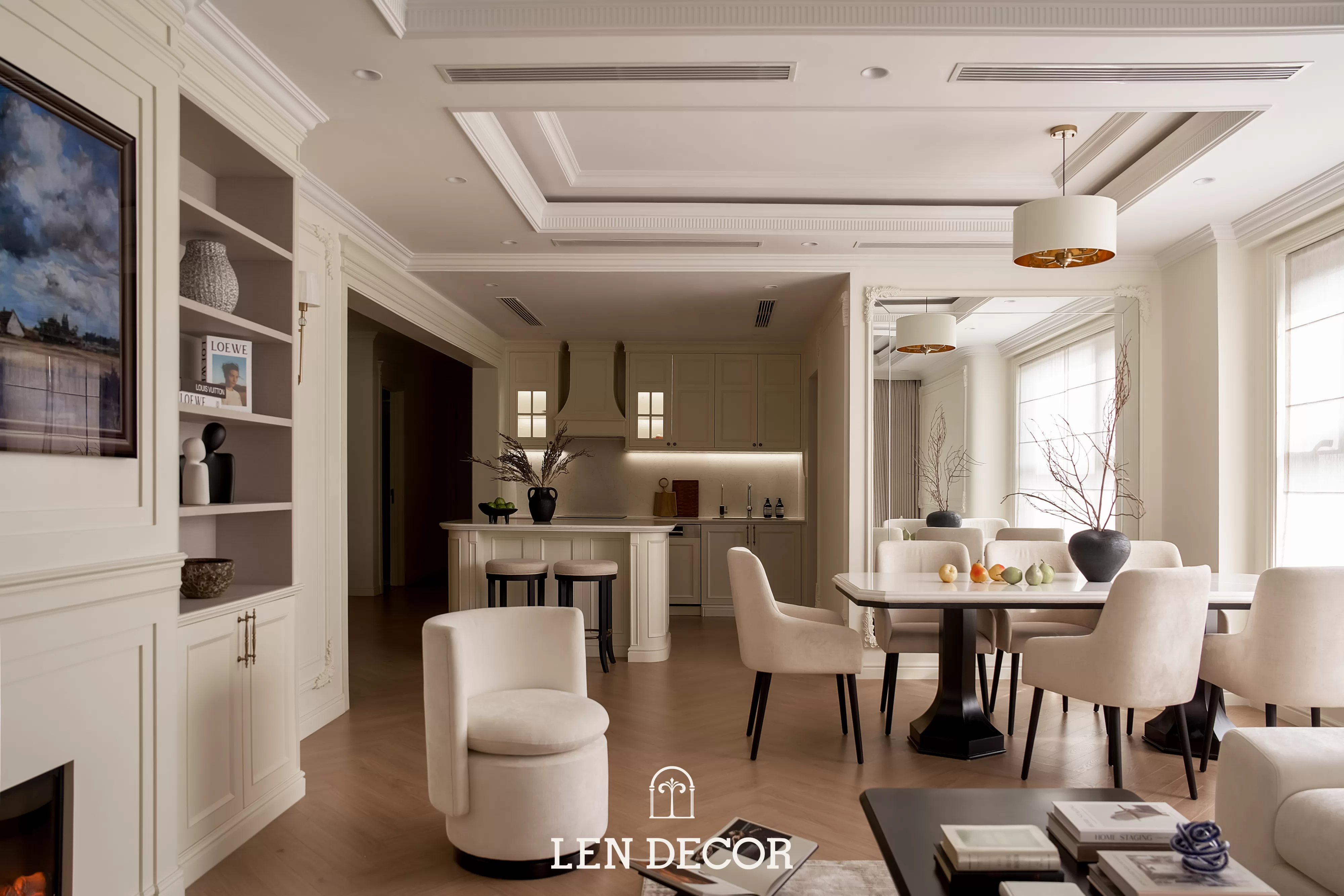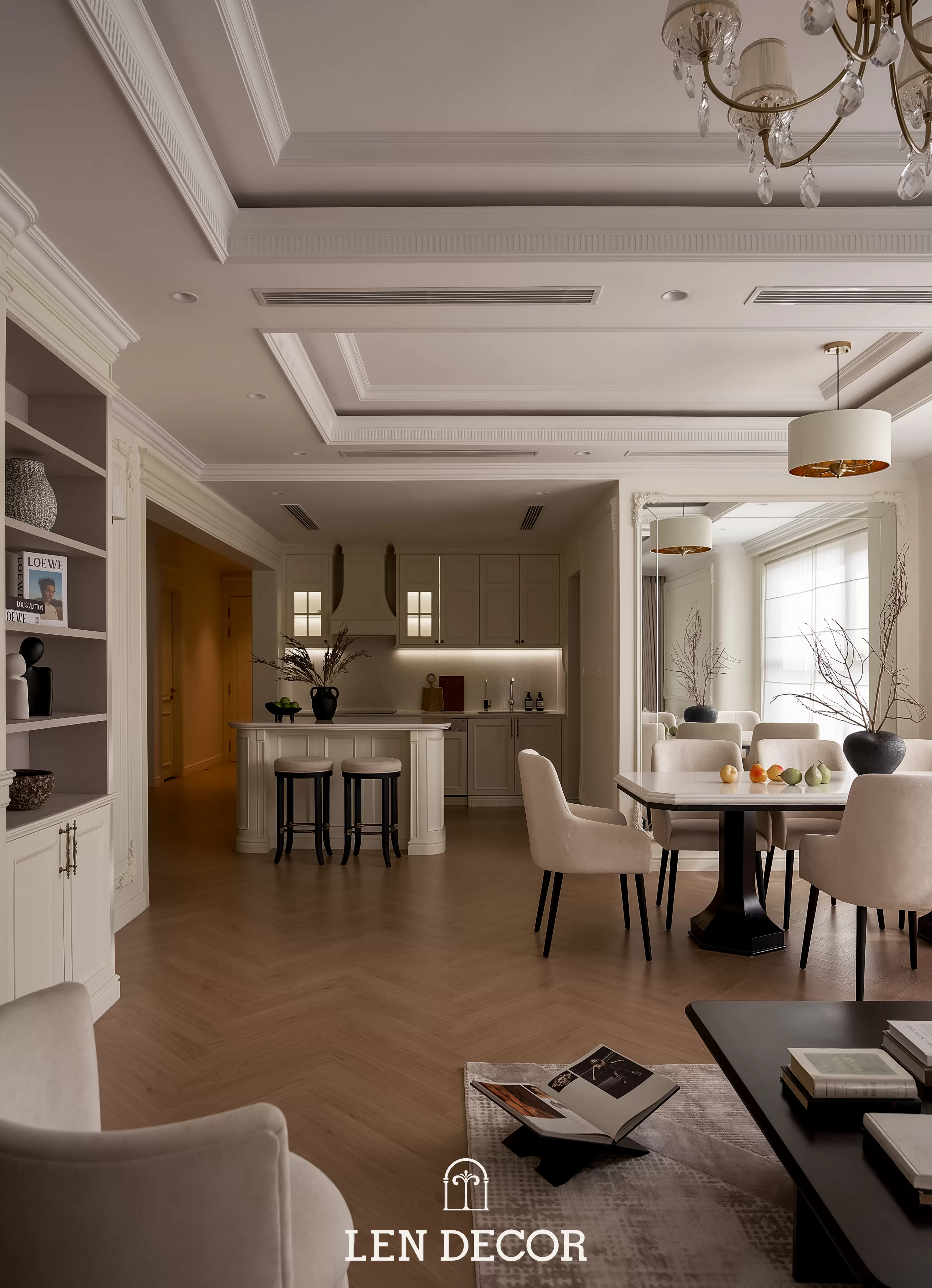 Trong không gian khoáng đạt của một “biệt thự trên không”, 𝑳𝒆𝒏 𝑫𝒆𝒄𝒐𝒓 chọn lối thiết kế mở để phòng khách, bàn ăn và bếp được kết nối. Tại đây, tình cảm gia đình sẽ thêm gắn kết qua mỗi bữa cơm ấm cúng hay những buổi chuyện trò sum vầy.
