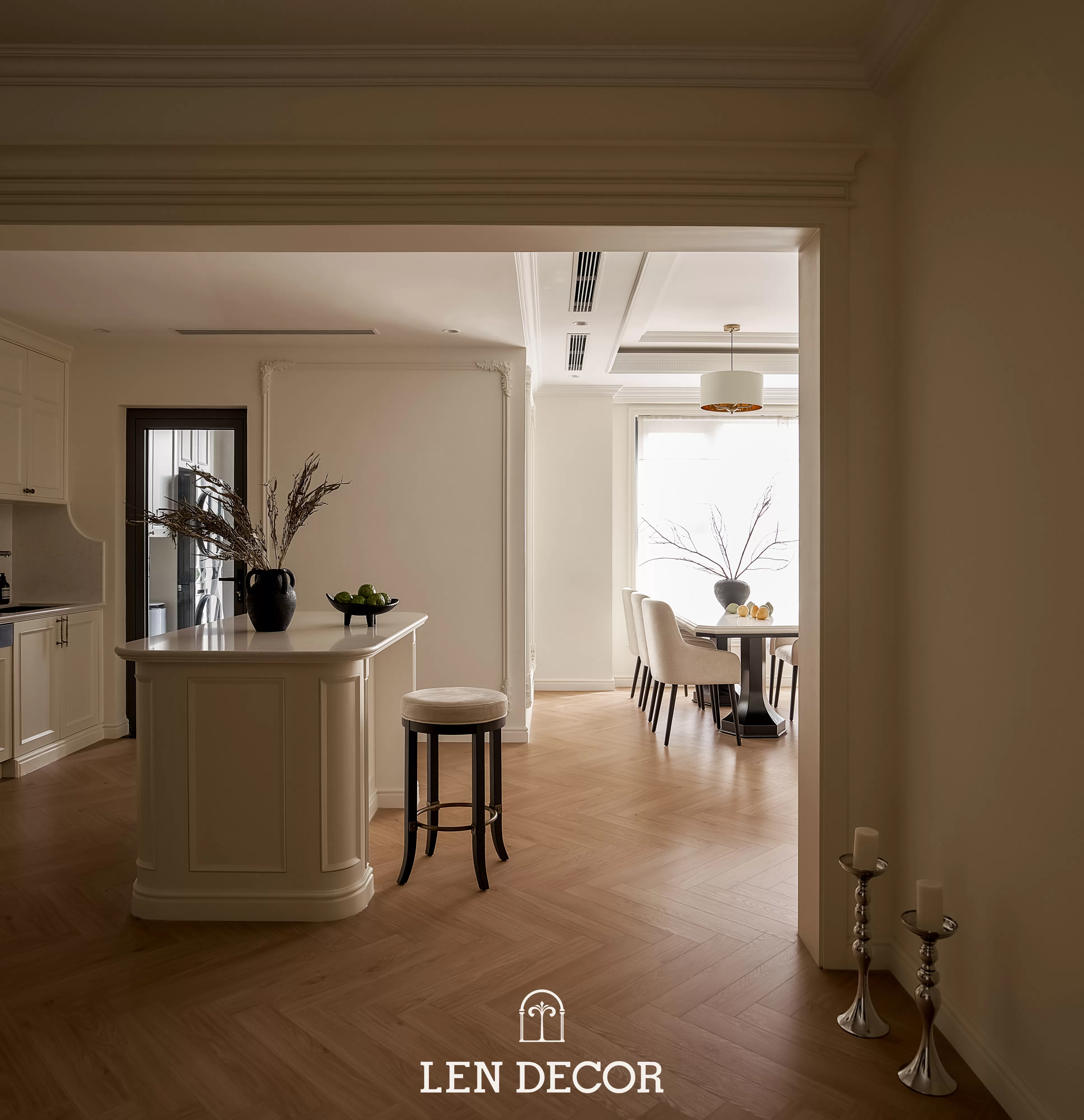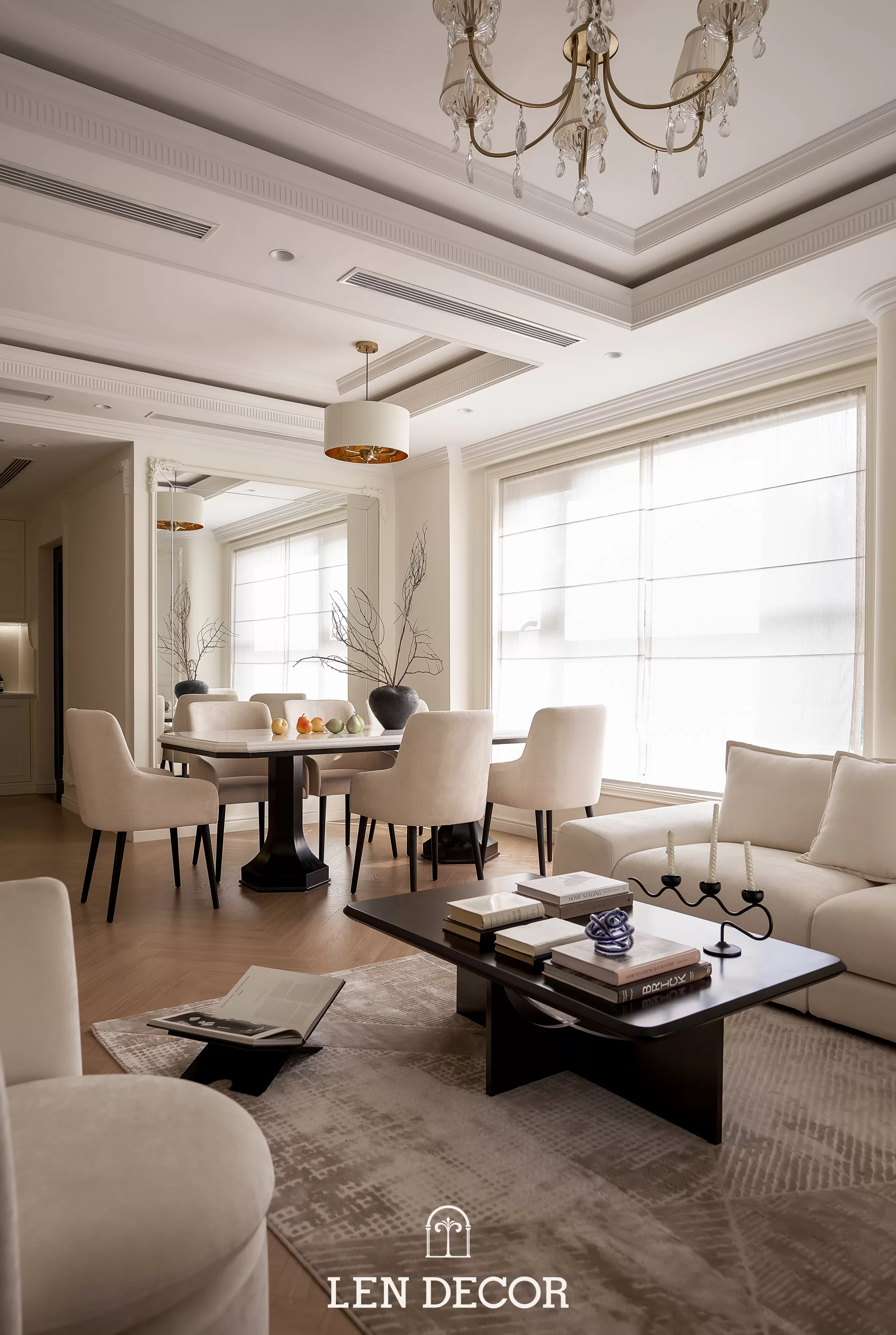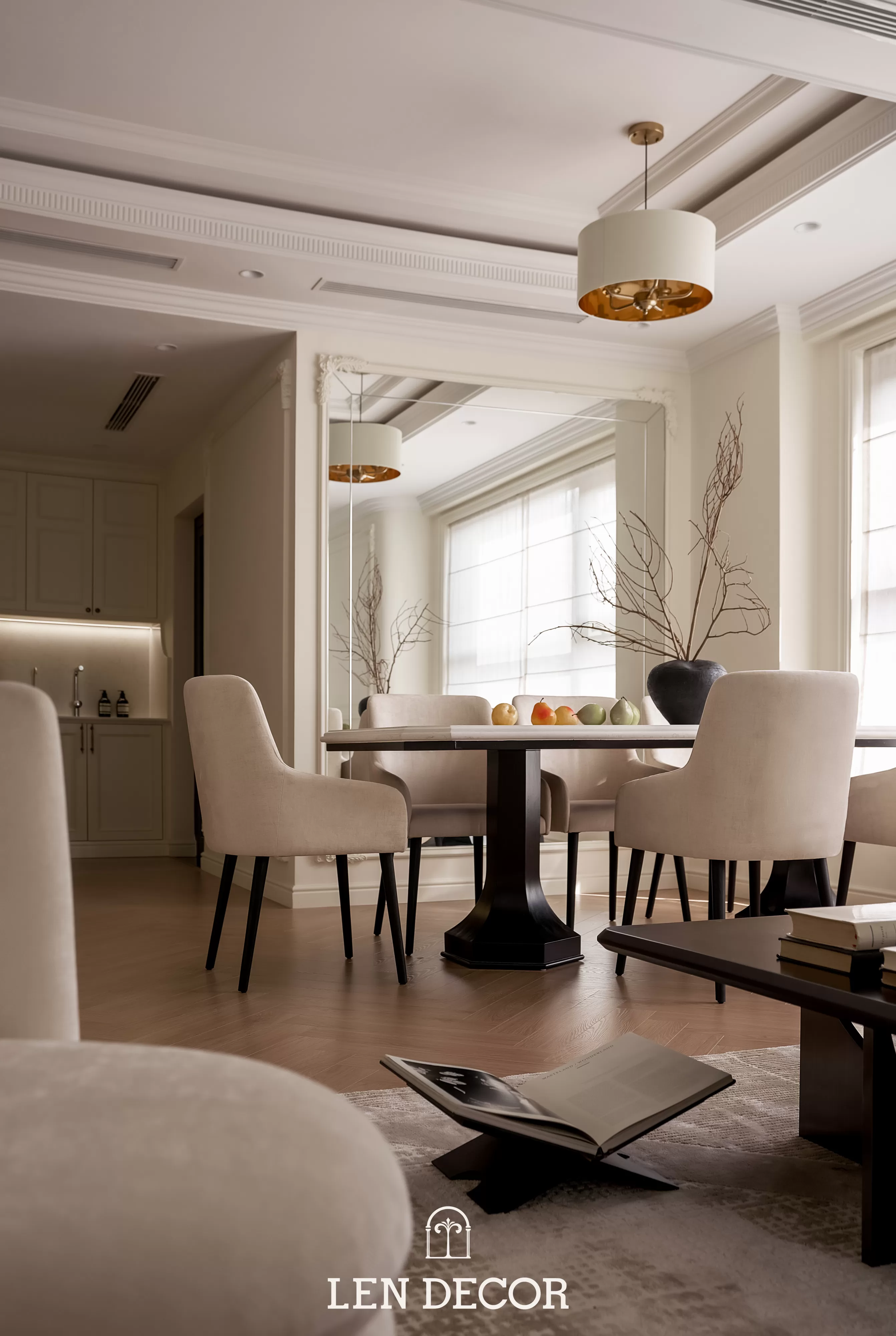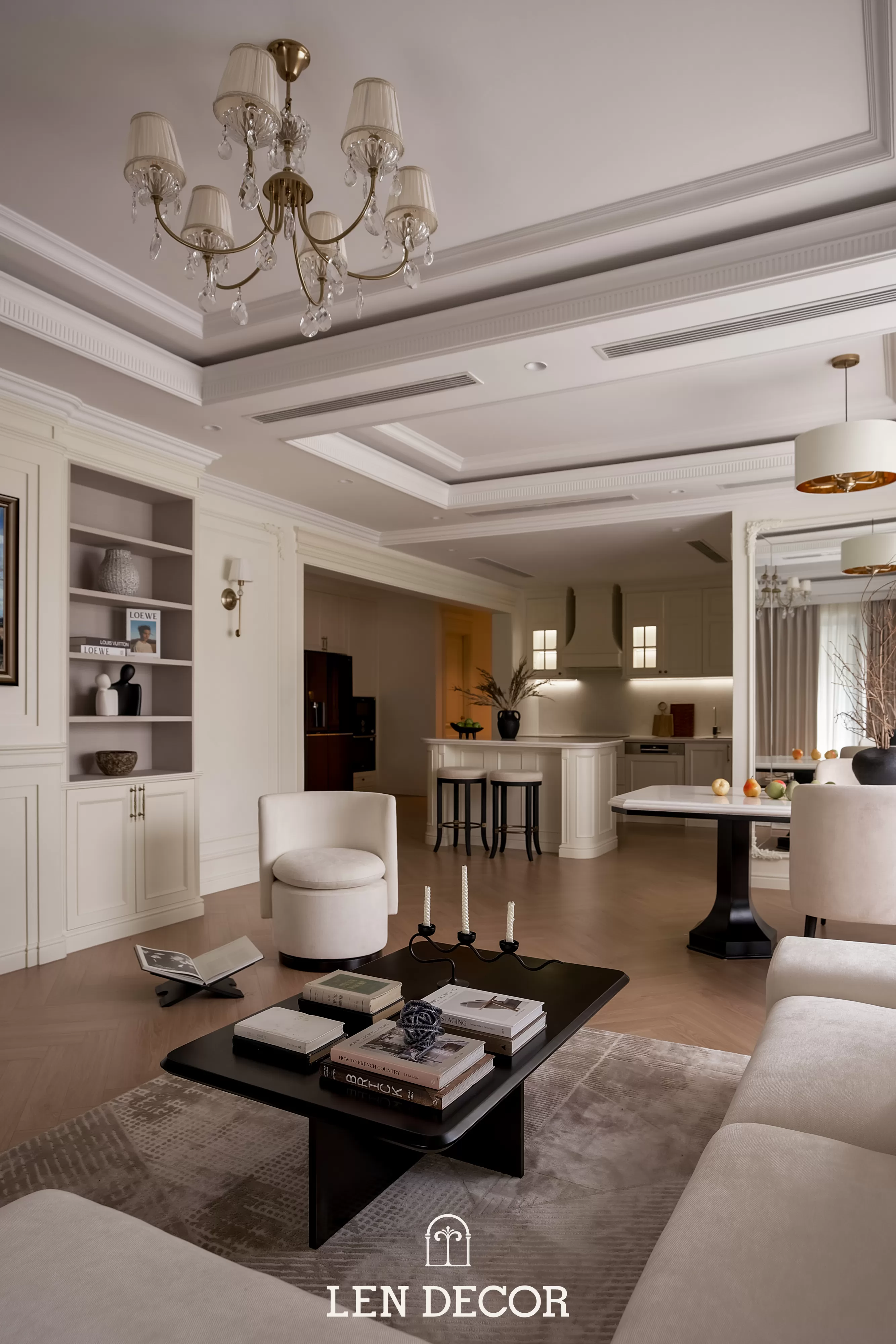 Trong không gian khoáng đạt của một “biệt thự trên không”, 𝑳𝒆𝒏 𝑫𝒆𝒄𝒐𝒓 chọn lối thiết kế mở để phòng khách, bàn ăn và bếp được kết nối. Tại đây, tình cảm gia đình sẽ thêm gắn kết qua mỗi bữa cơm ấm cúng hay những buổi chuyện trò sum vầy.
