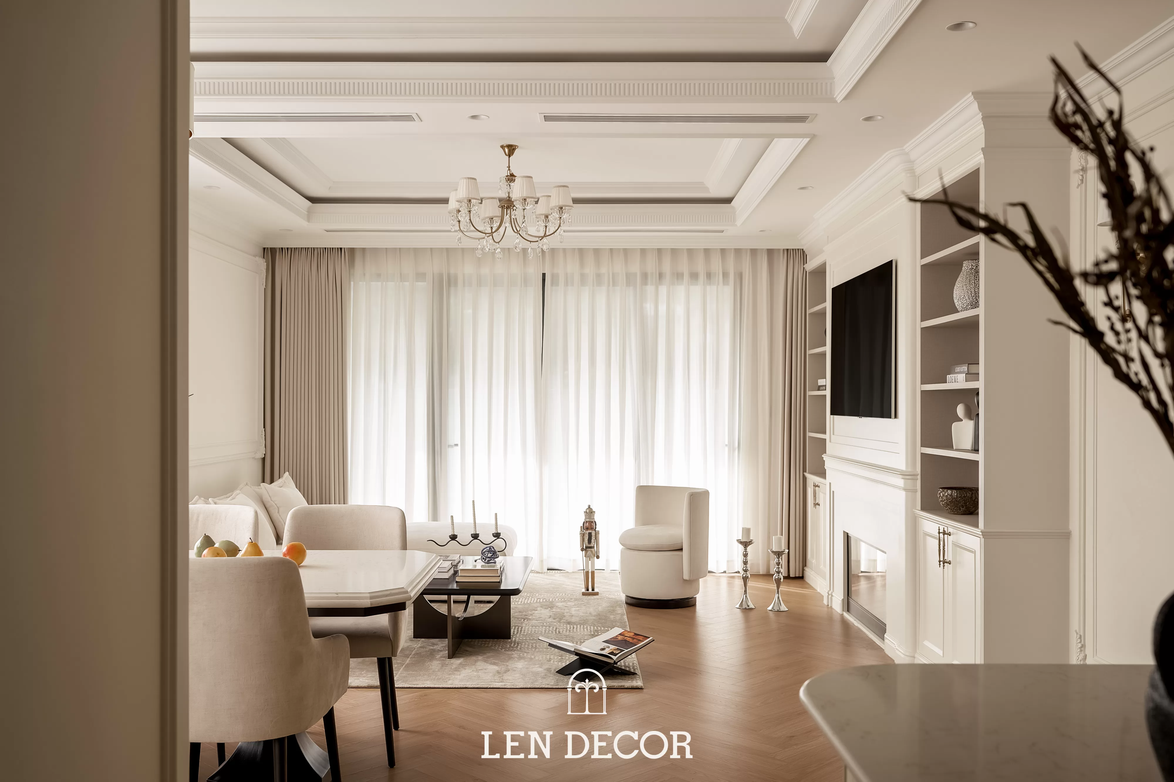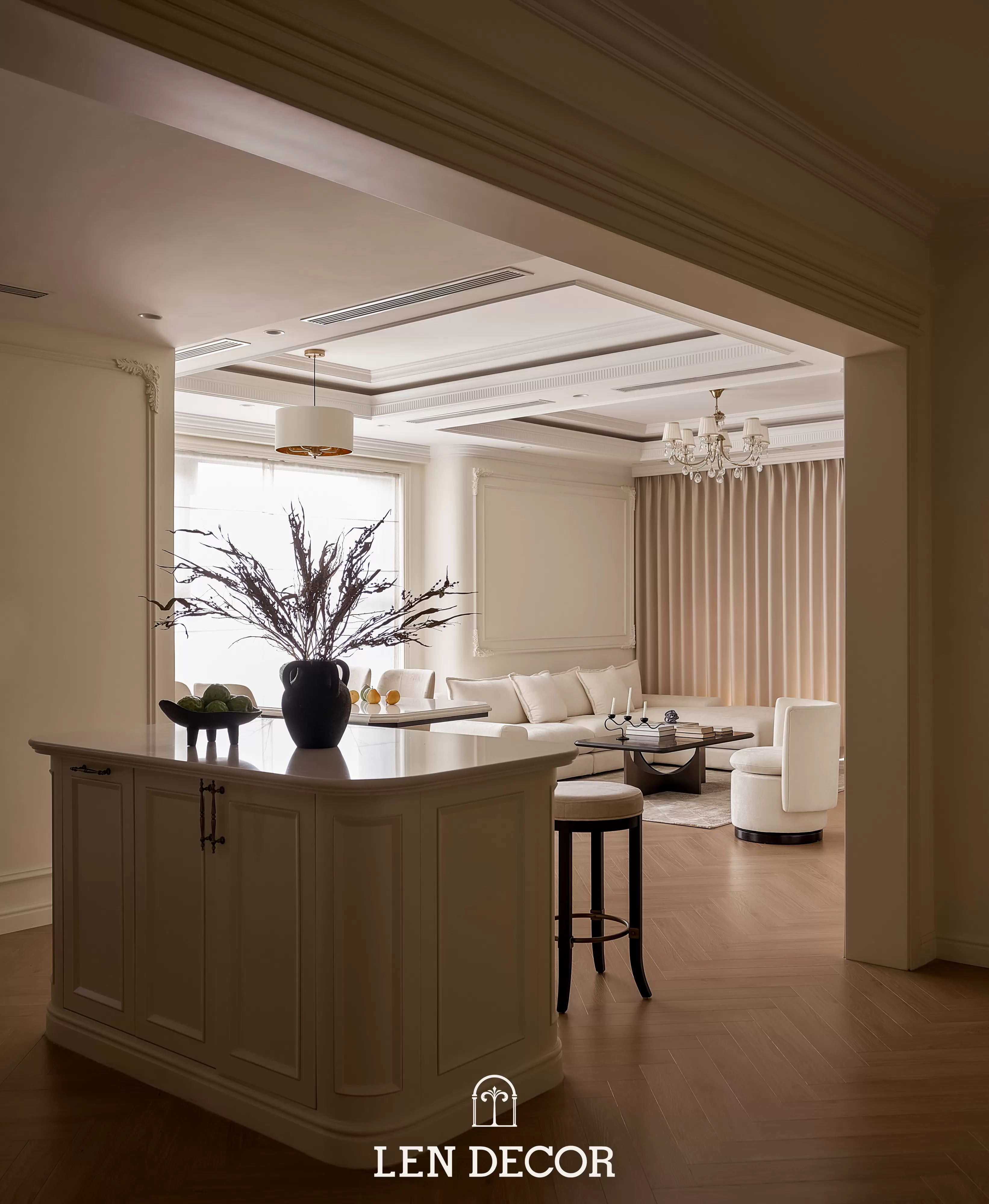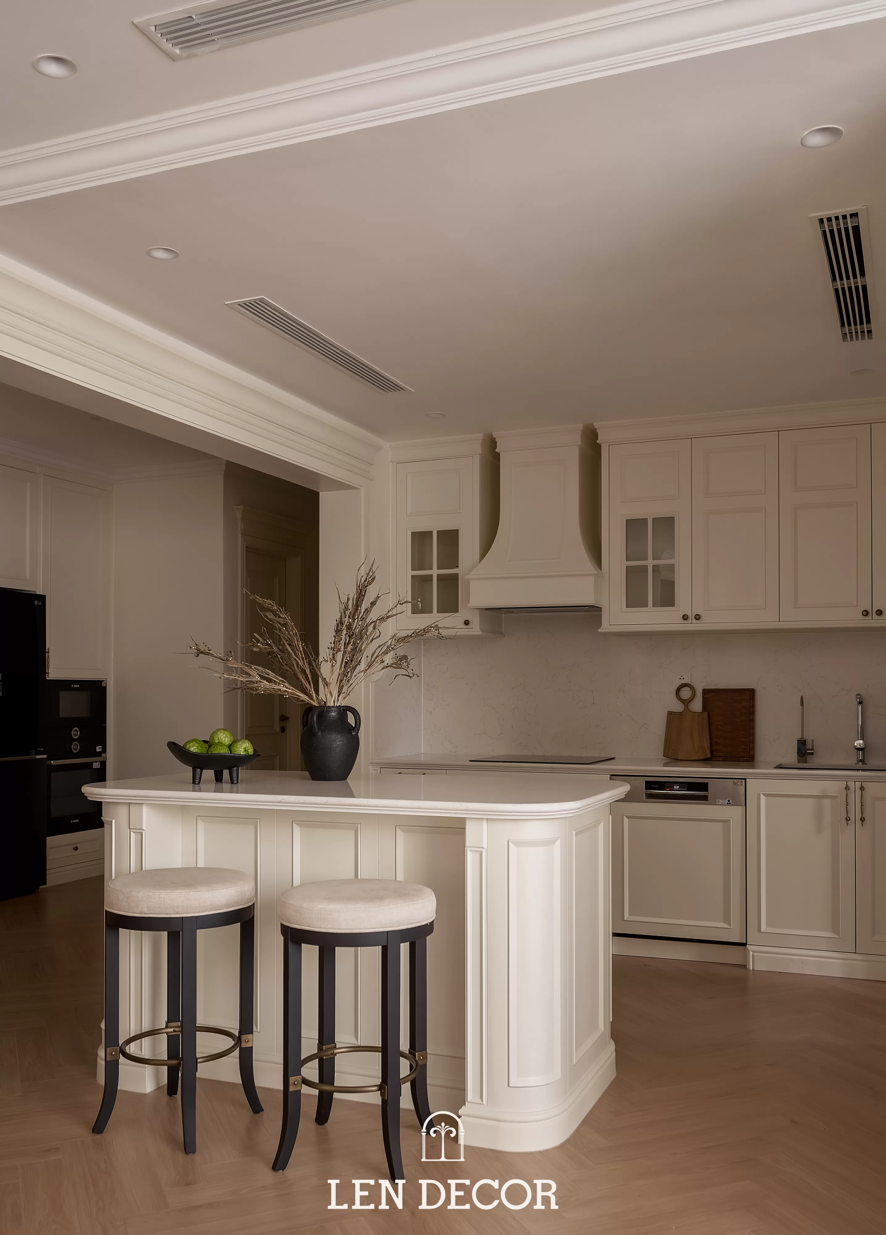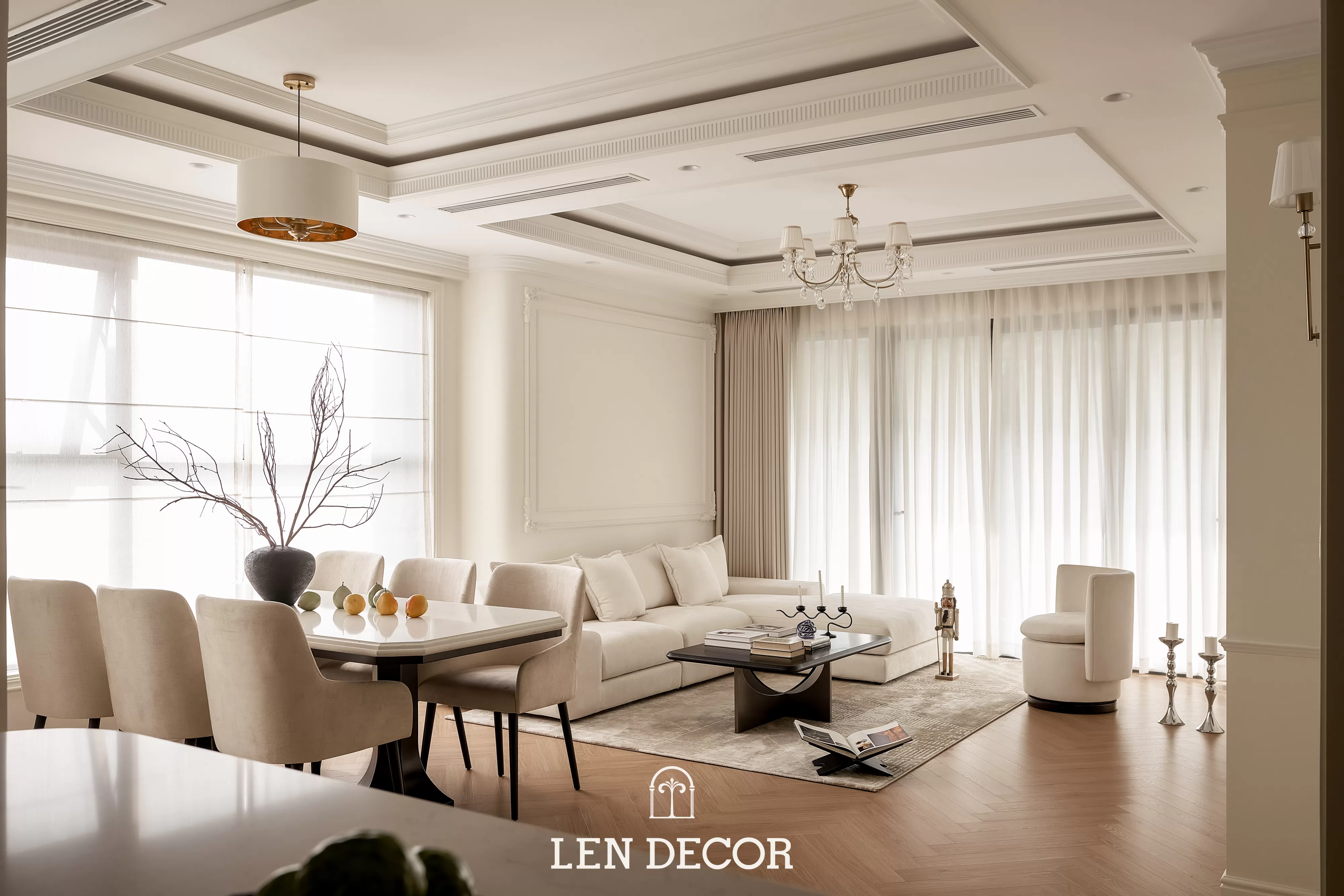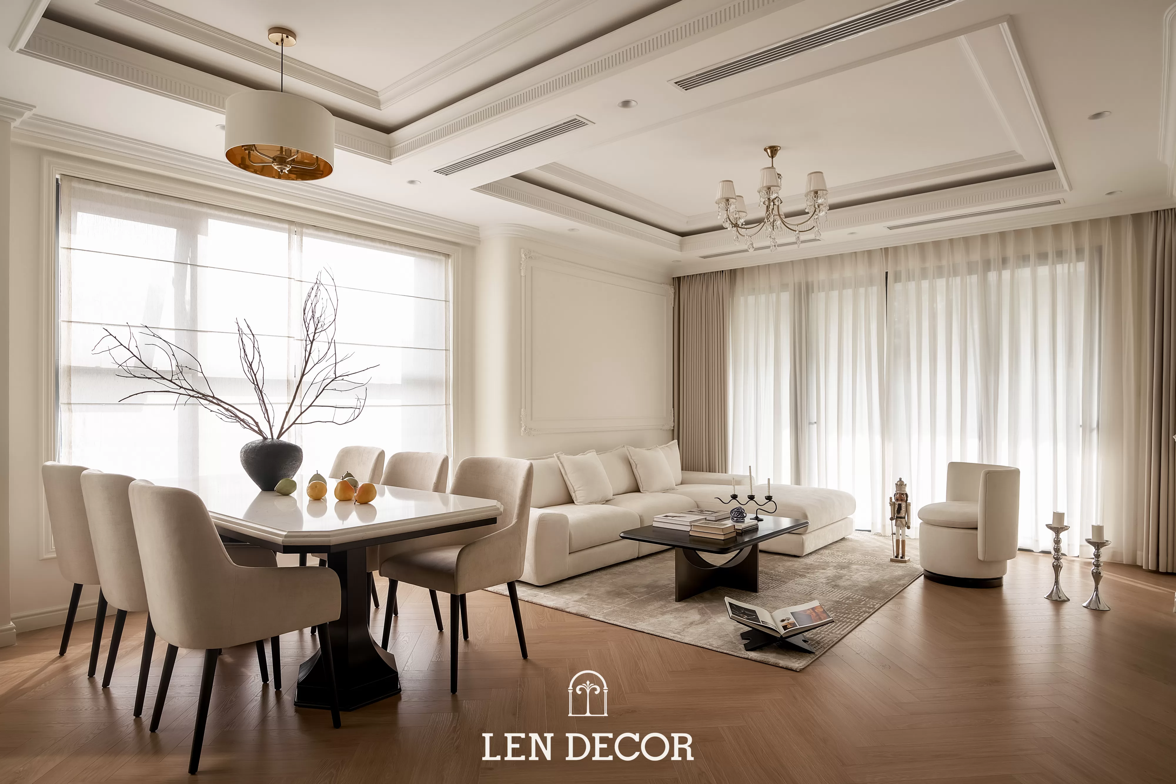 Trong không gian khoáng đạt của một “biệt thự trên không”, 𝑳𝒆𝒏 𝑫𝒆𝒄𝒐𝒓 chọn lối thiết kế mở để phòng khách, bàn ăn và bếp được kết nối. Tại đây, tình cảm gia đình sẽ thêm gắn kết qua mỗi bữa cơm ấm cúng hay những buổi chuyện trò sum vầy.