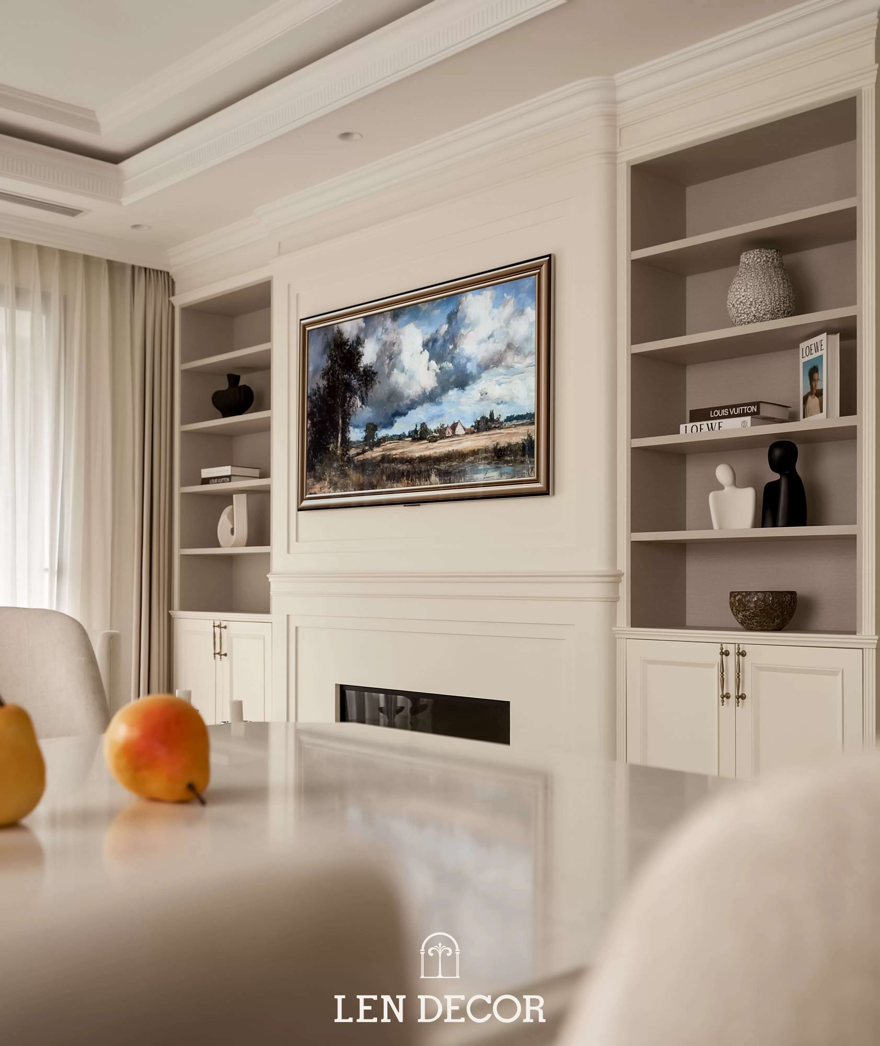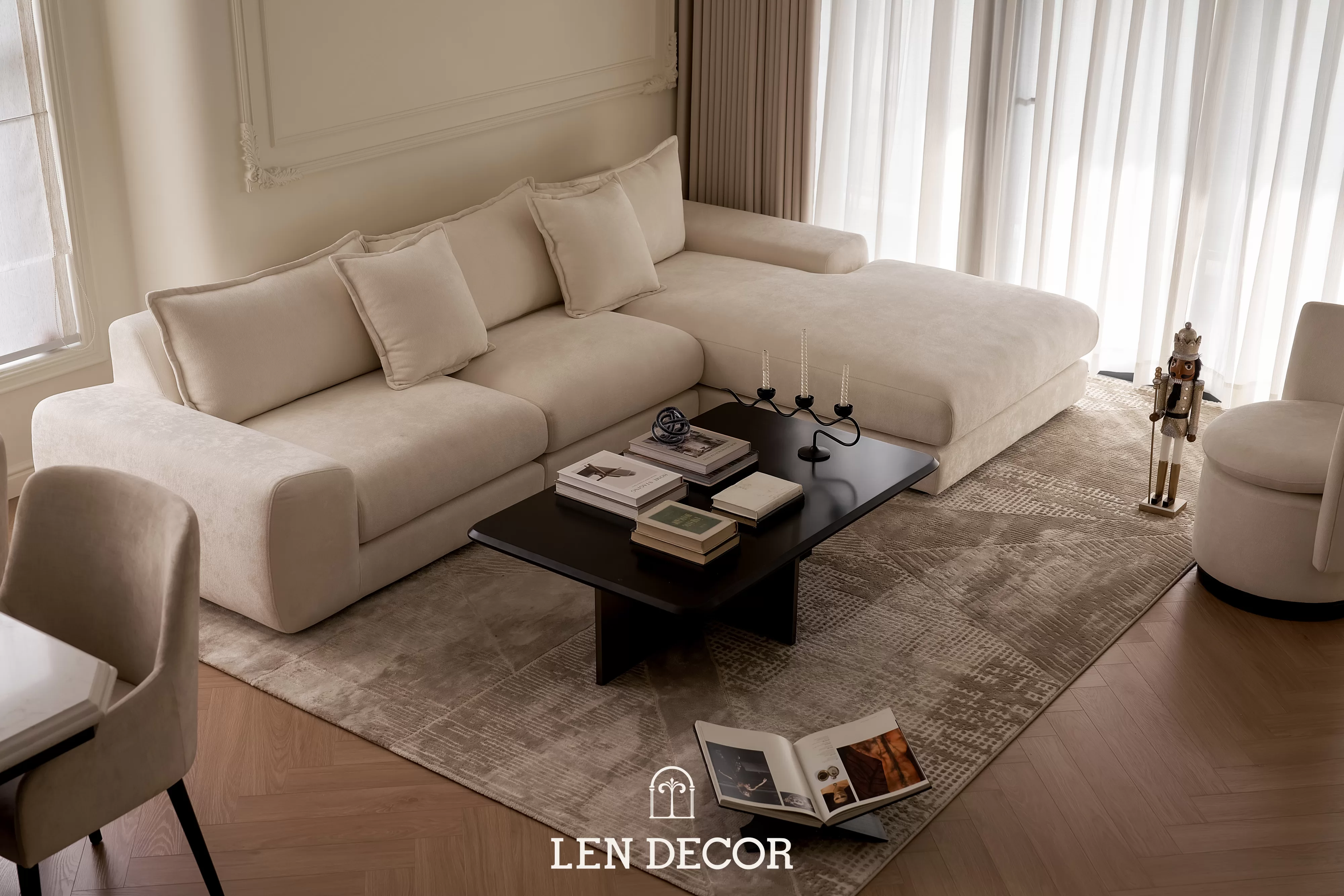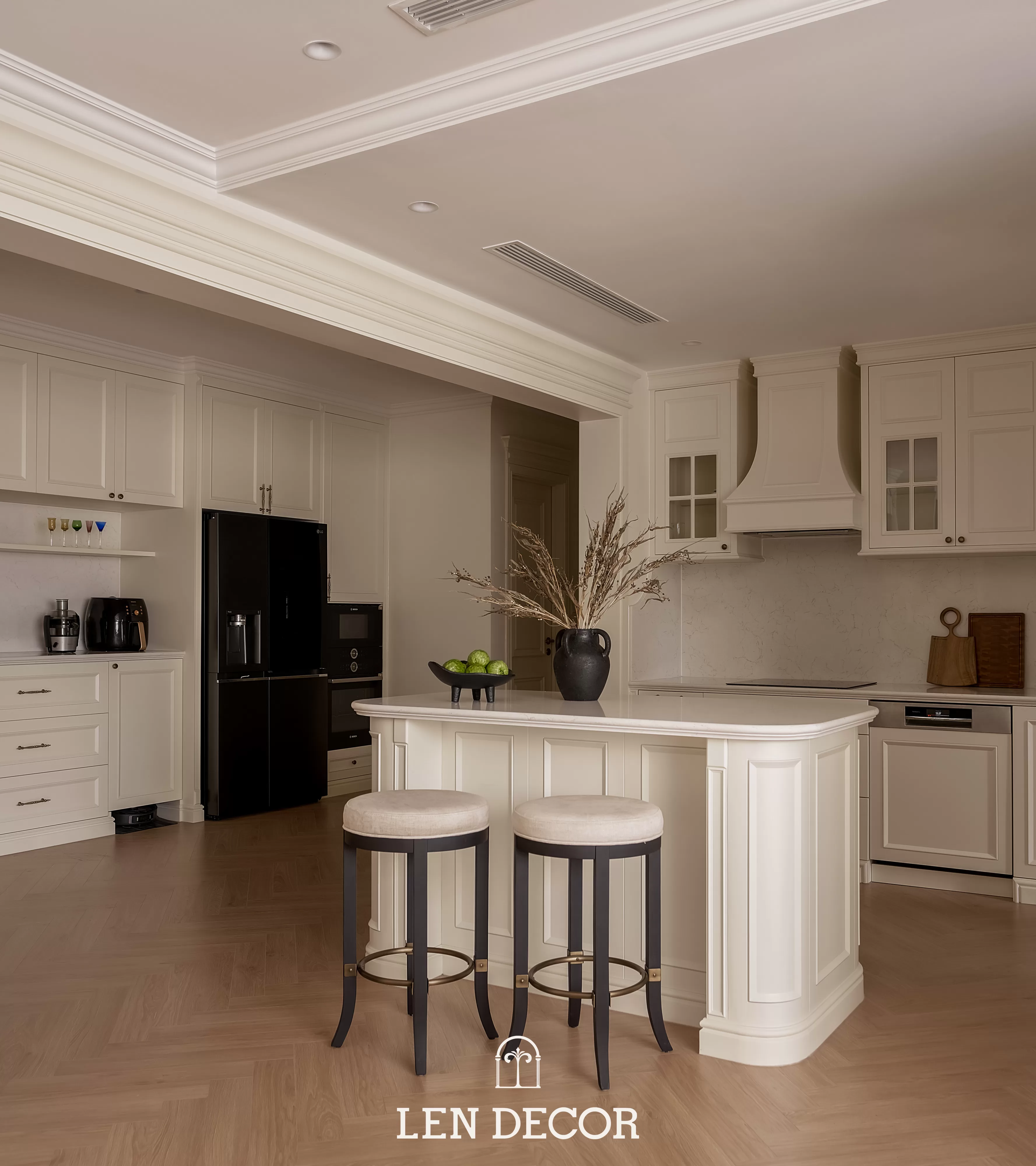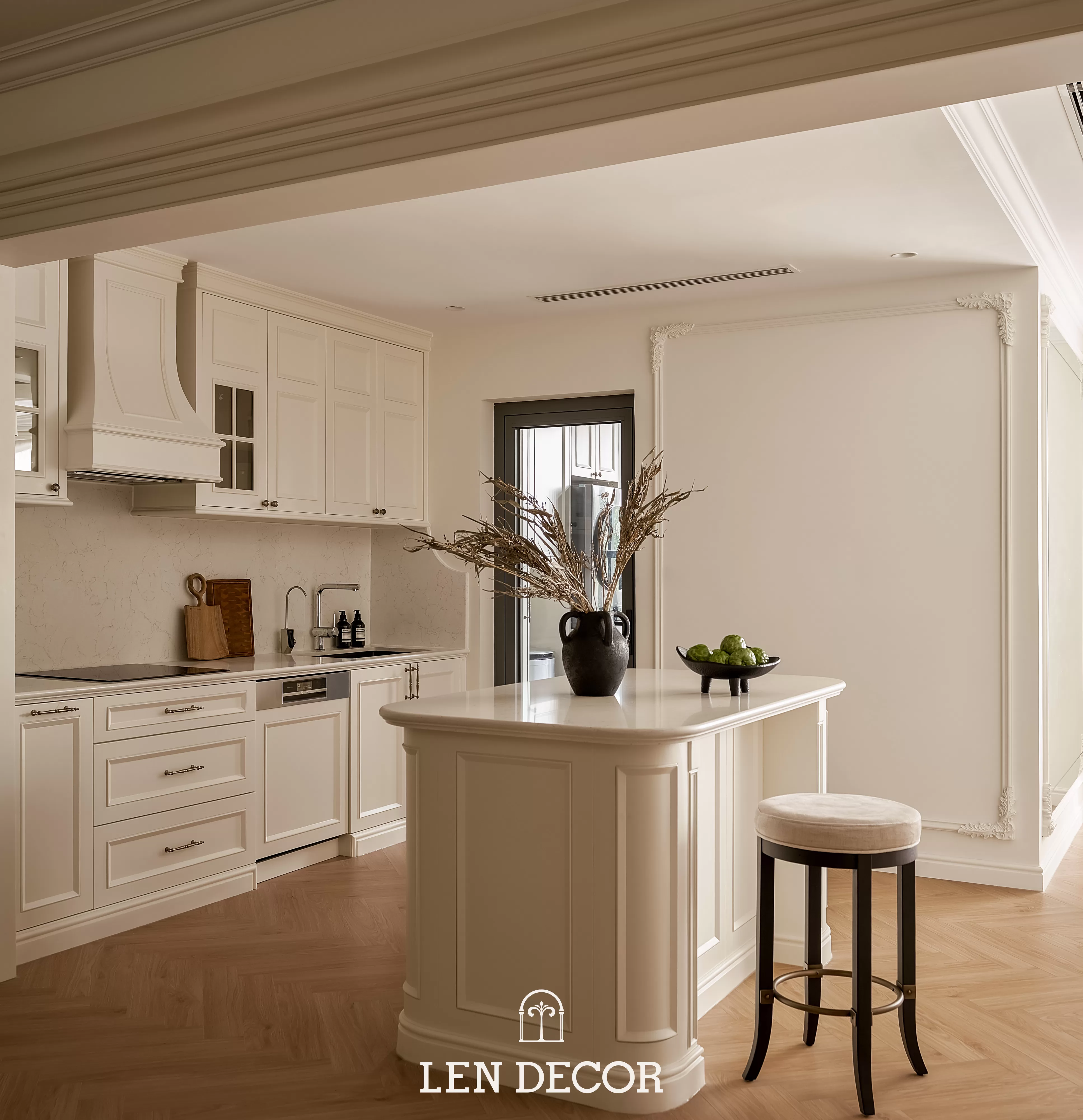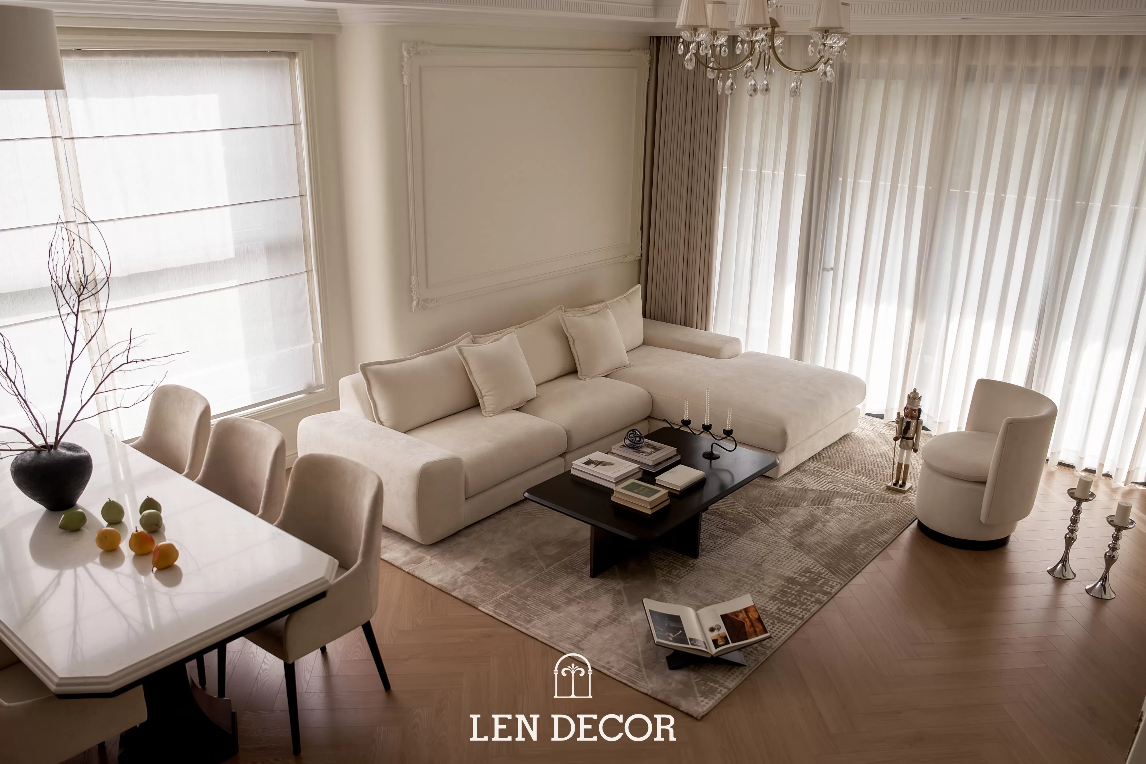 Trong không gian khoáng đạt của một “biệt thự trên không”, 𝑳𝒆𝒏 𝑫𝒆𝒄𝒐𝒓 chọn lối thiết kế mở để phòng khách, bàn ăn và bếp được kết nối. Tại đây, tình cảm gia đình sẽ thêm gắn kết qua mỗi bữa cơm ấm cúng hay những buổi chuyện trò sum vầy.