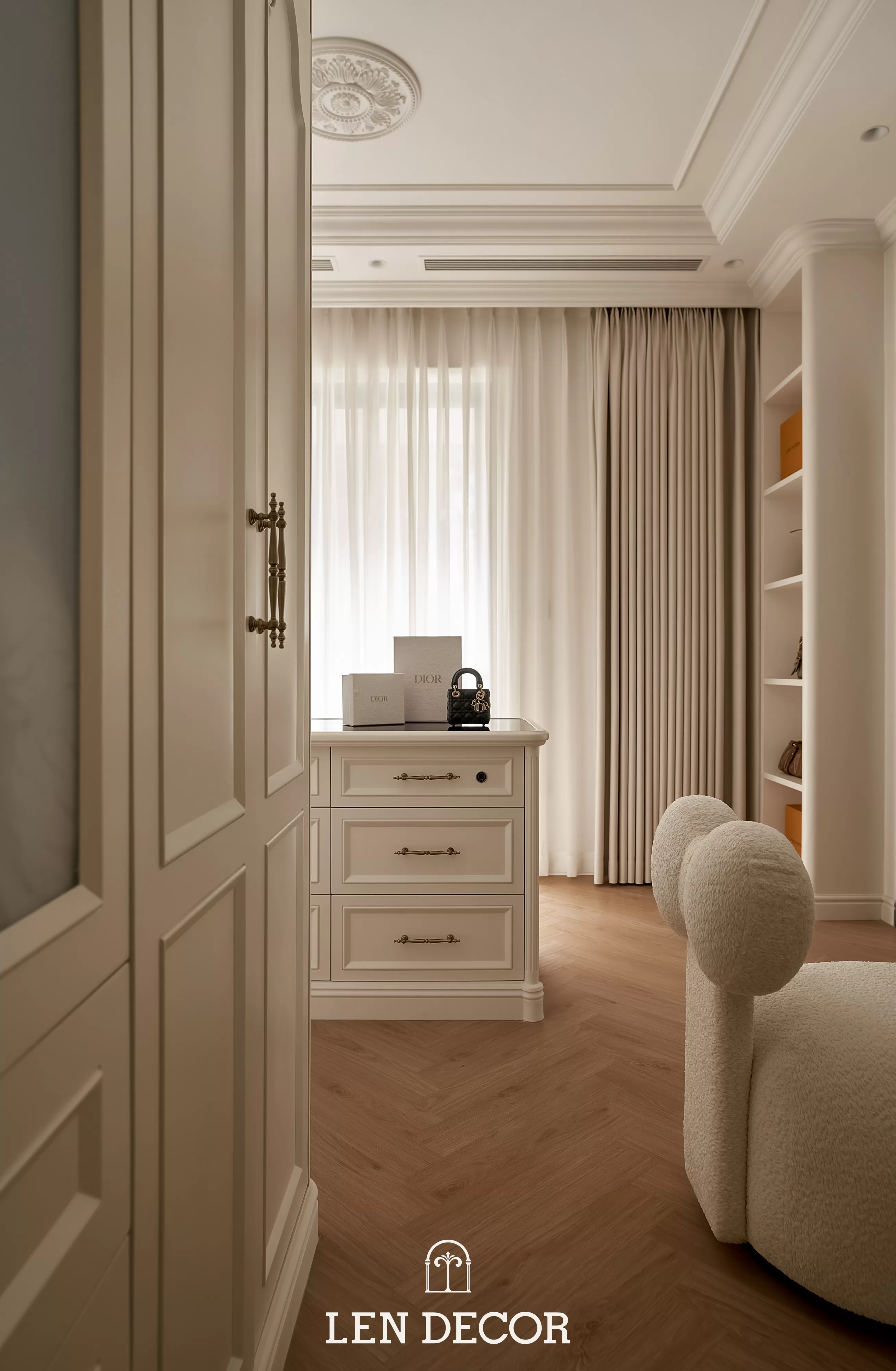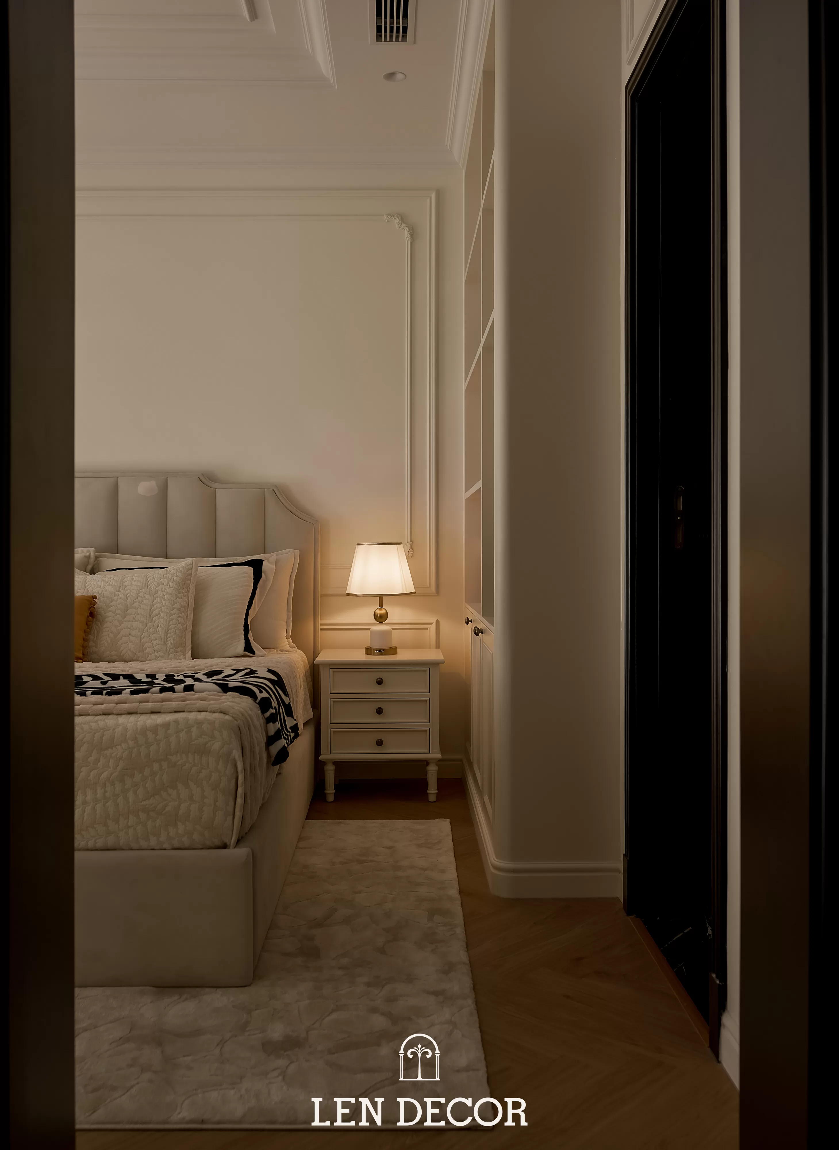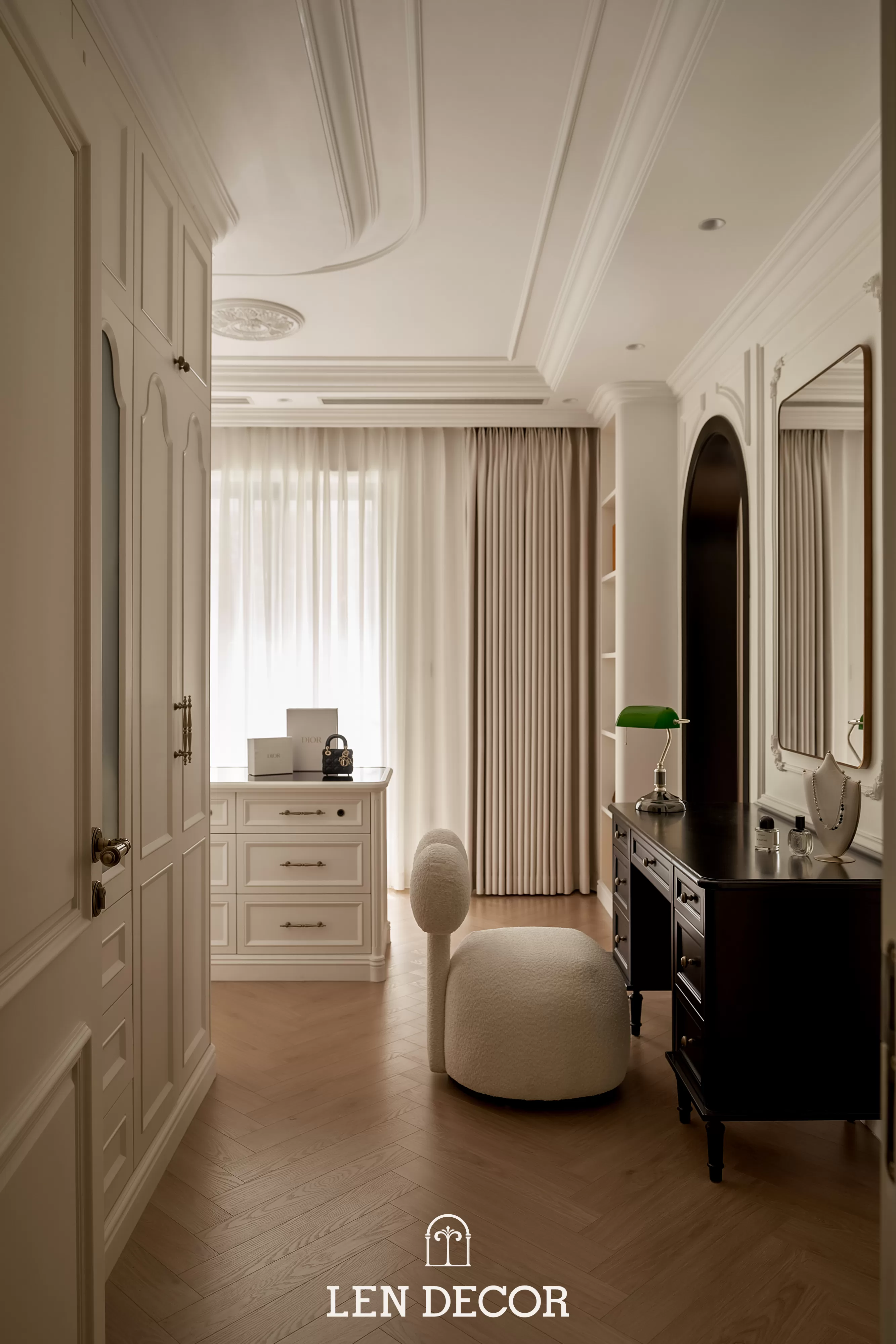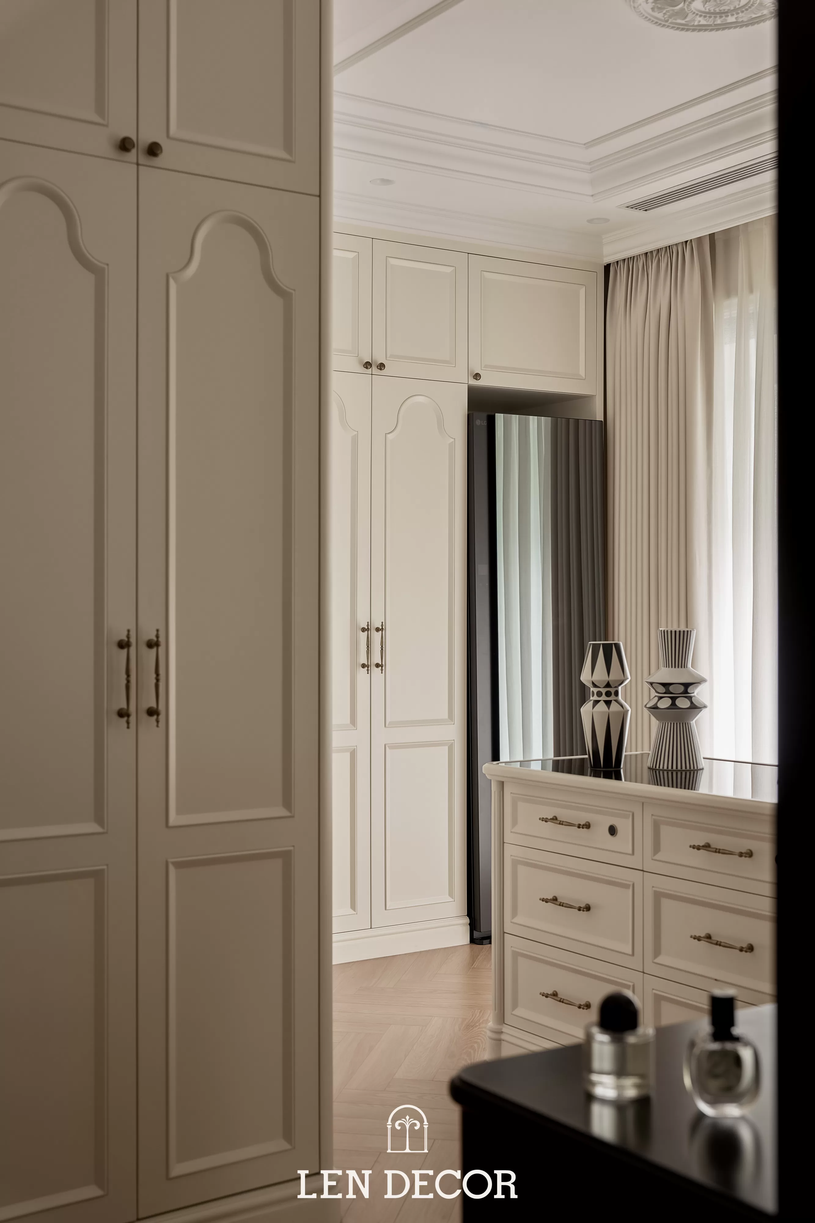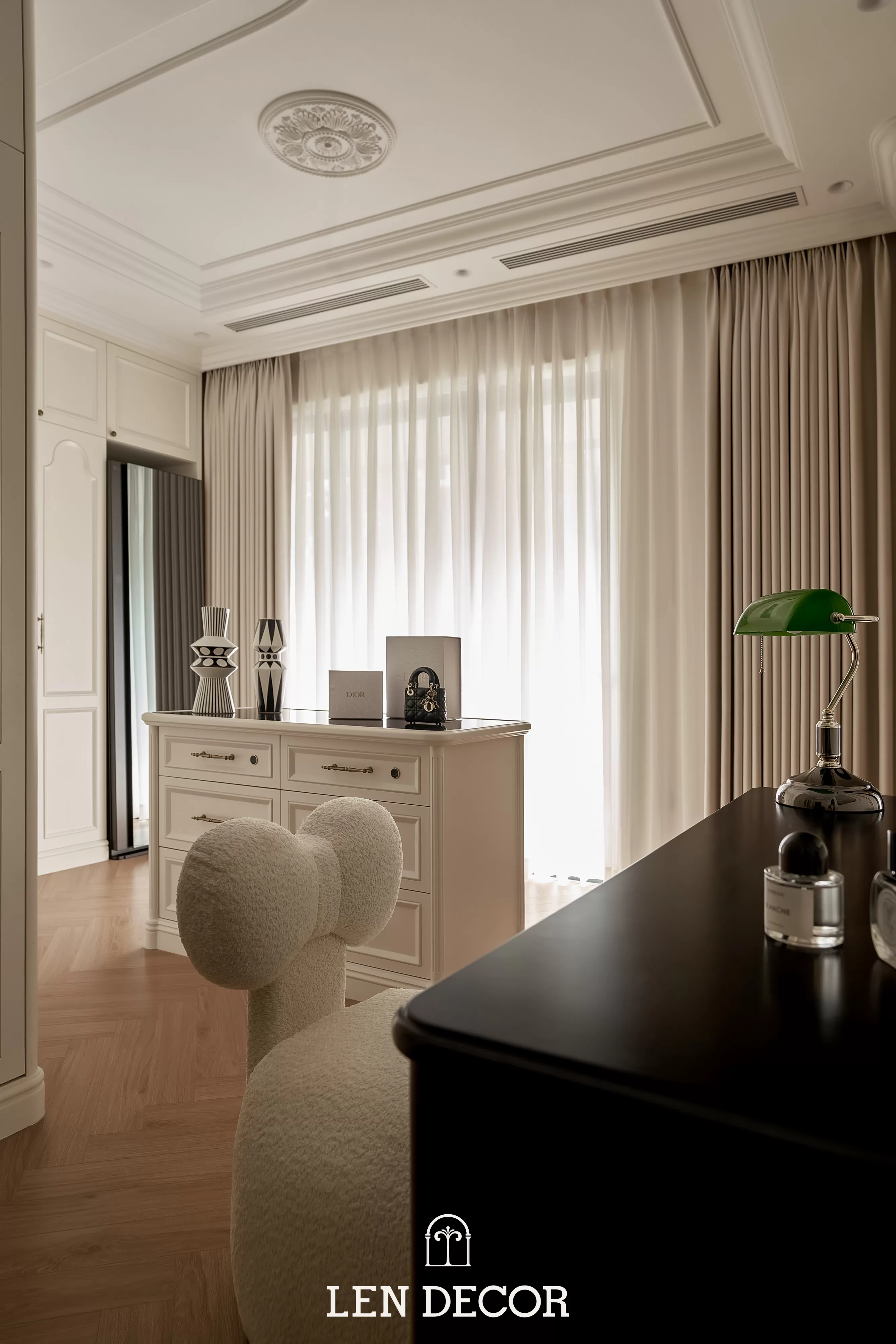 Căn hộ tại 𝑪𝒆𝒍𝒂𝒅𝒐𝒏 𝑪𝒊𝒕𝒚 sẽ đón chào gia chủ bằng sắc cream white nhã nhặn và hệ cửa kính lớn, khéo léo đưa ánh nắng vào làm bừng sáng không gian. Cộng hưởng với ánh sáng, những đường chỉ mảnh trên tường hay trần giật cấp nhẹ nhàng trở thành điểm nhấn, tạo thêm chiều sâu và sự sang trọng cho tổng thể.