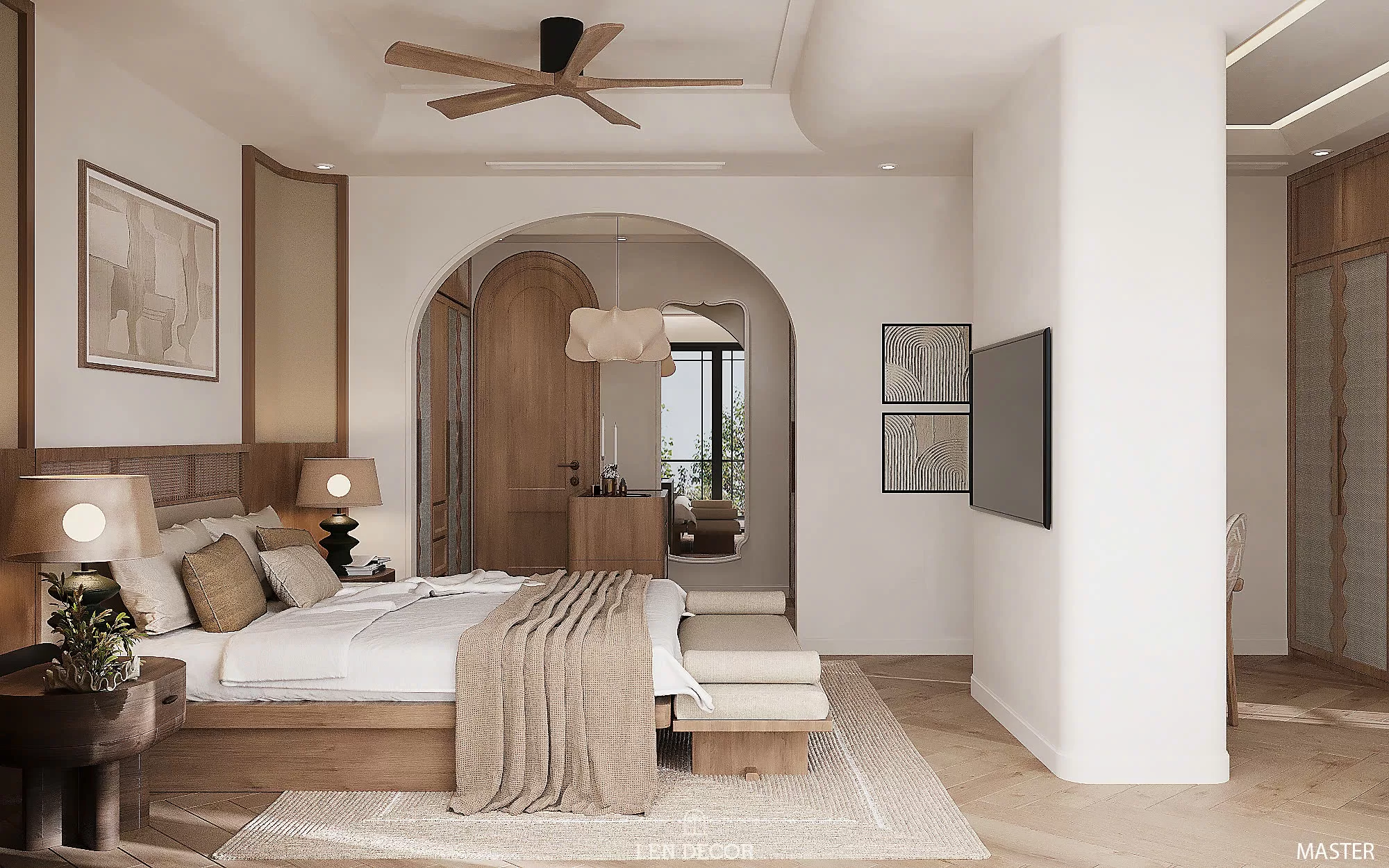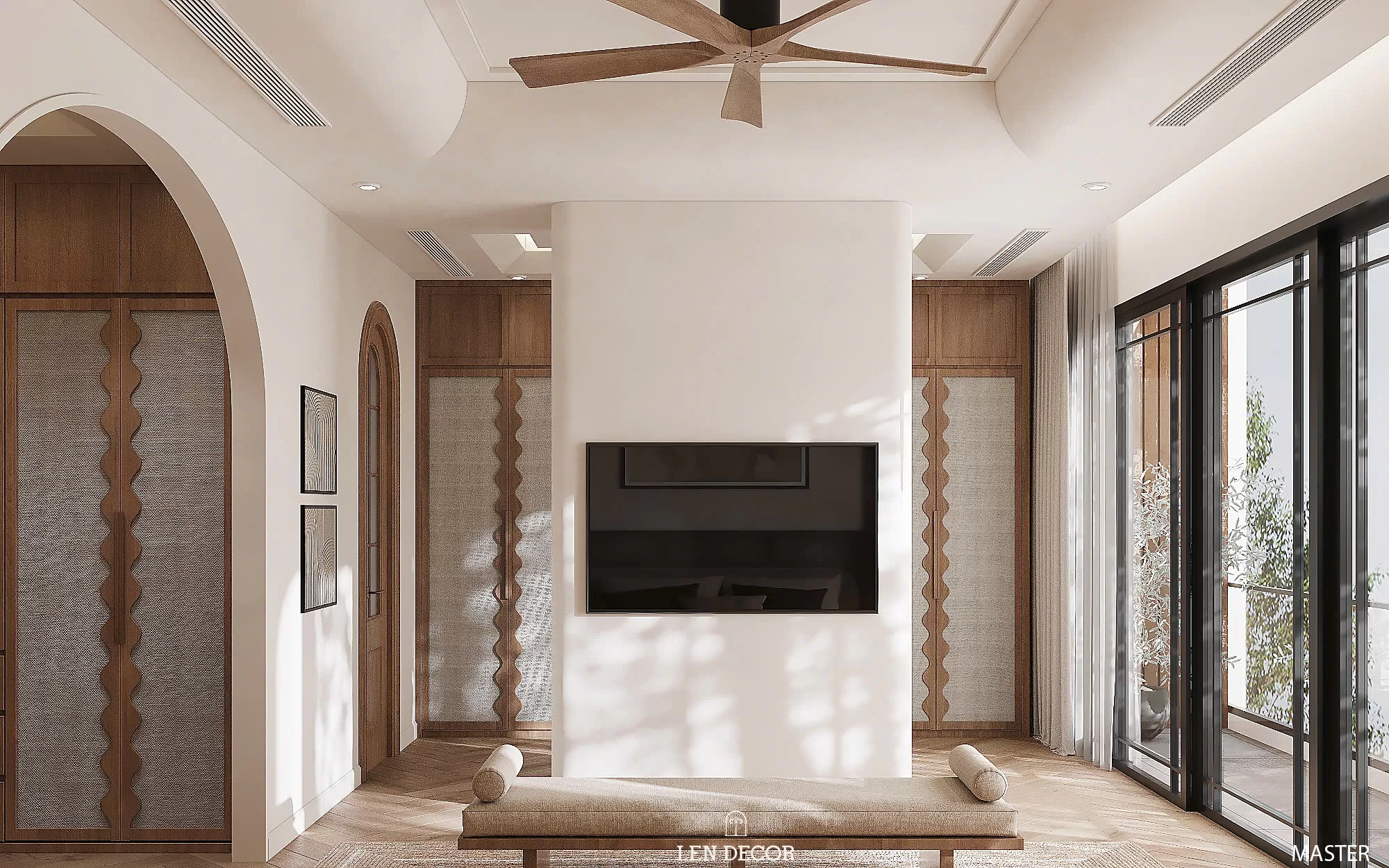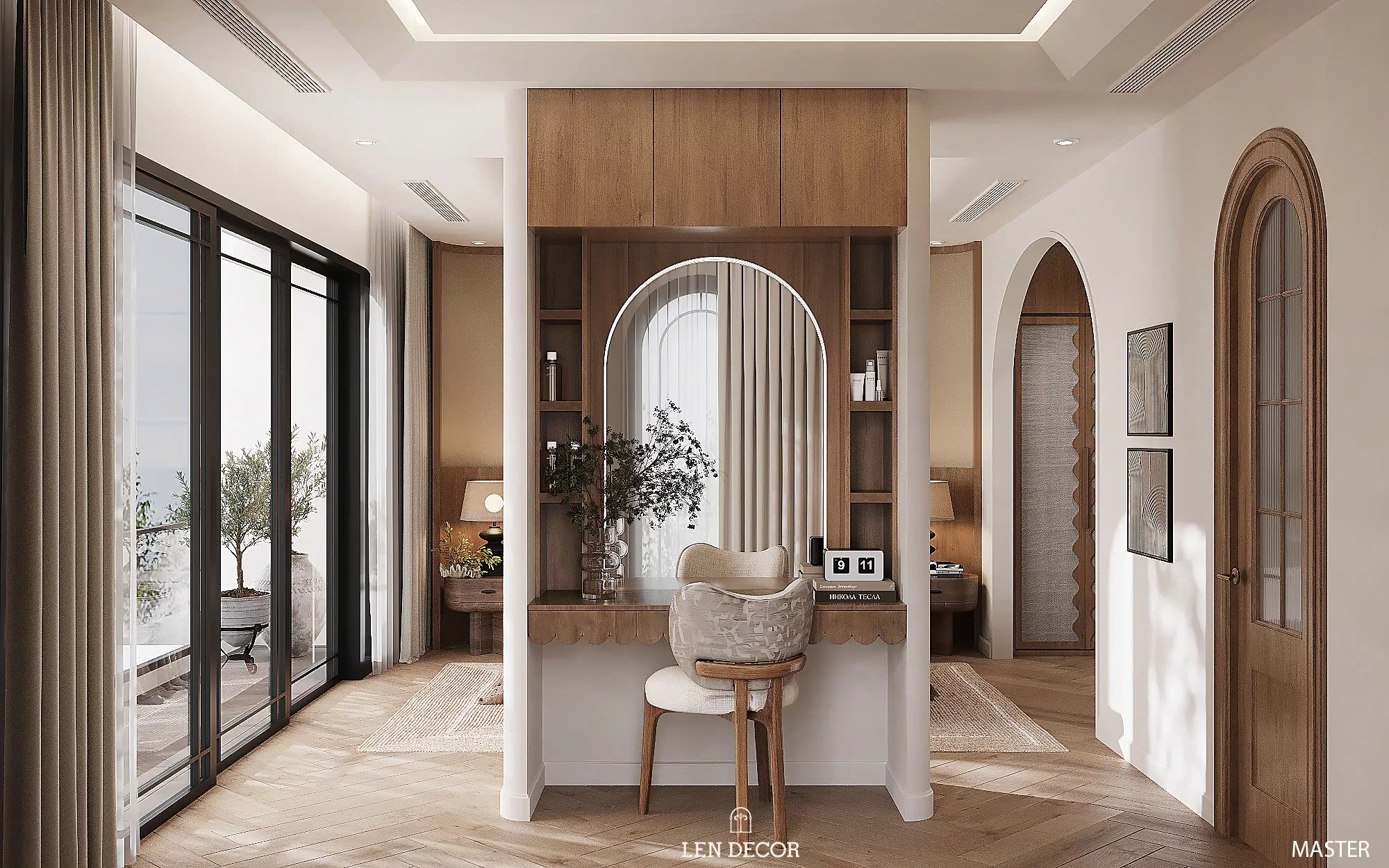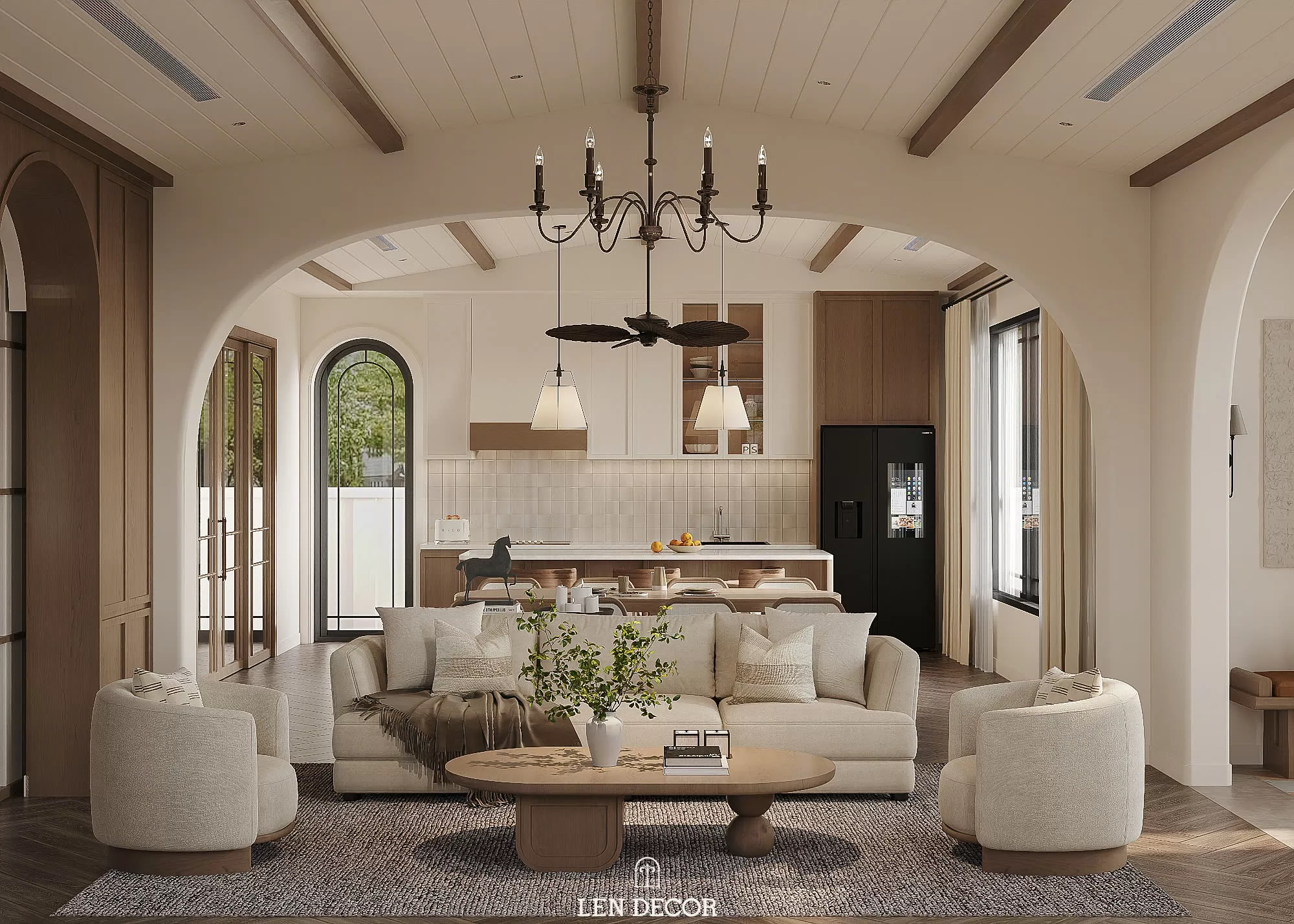 Không gian được tinh giản các chi tiết trang trí, kết hợp với những ô cửa vòm và đường nét thanh mảnh tạo nên sự dễ chịu về mặt thị giác.