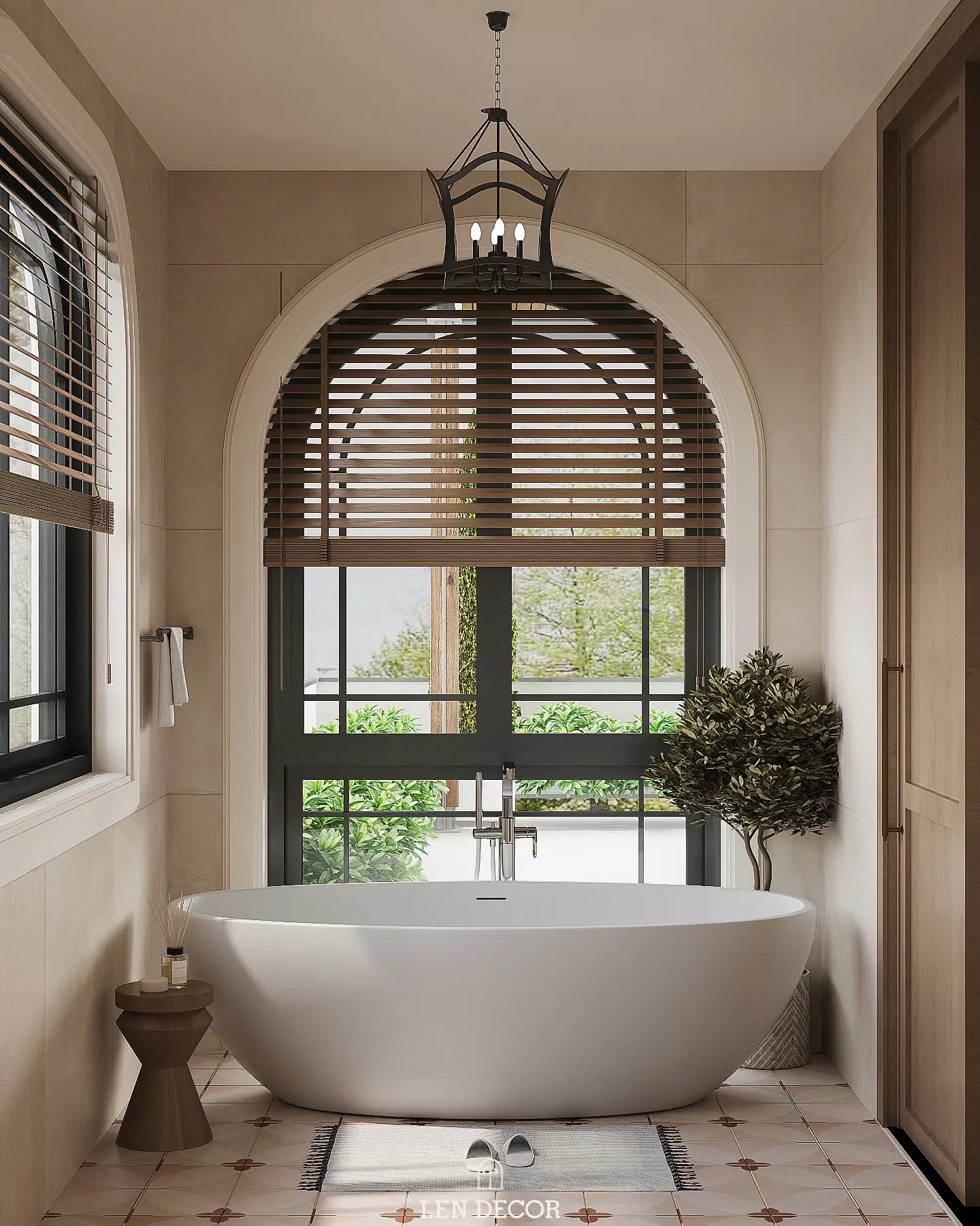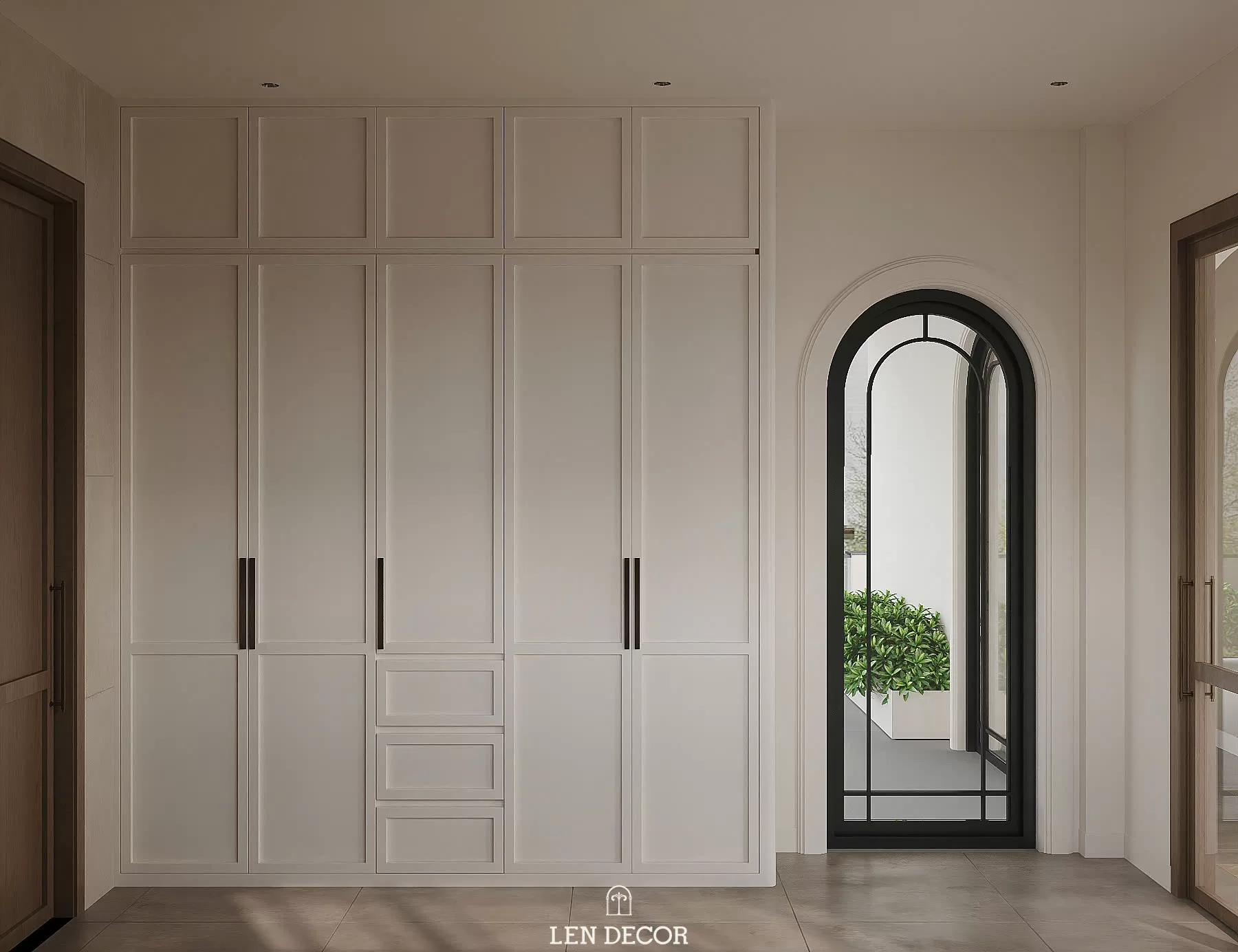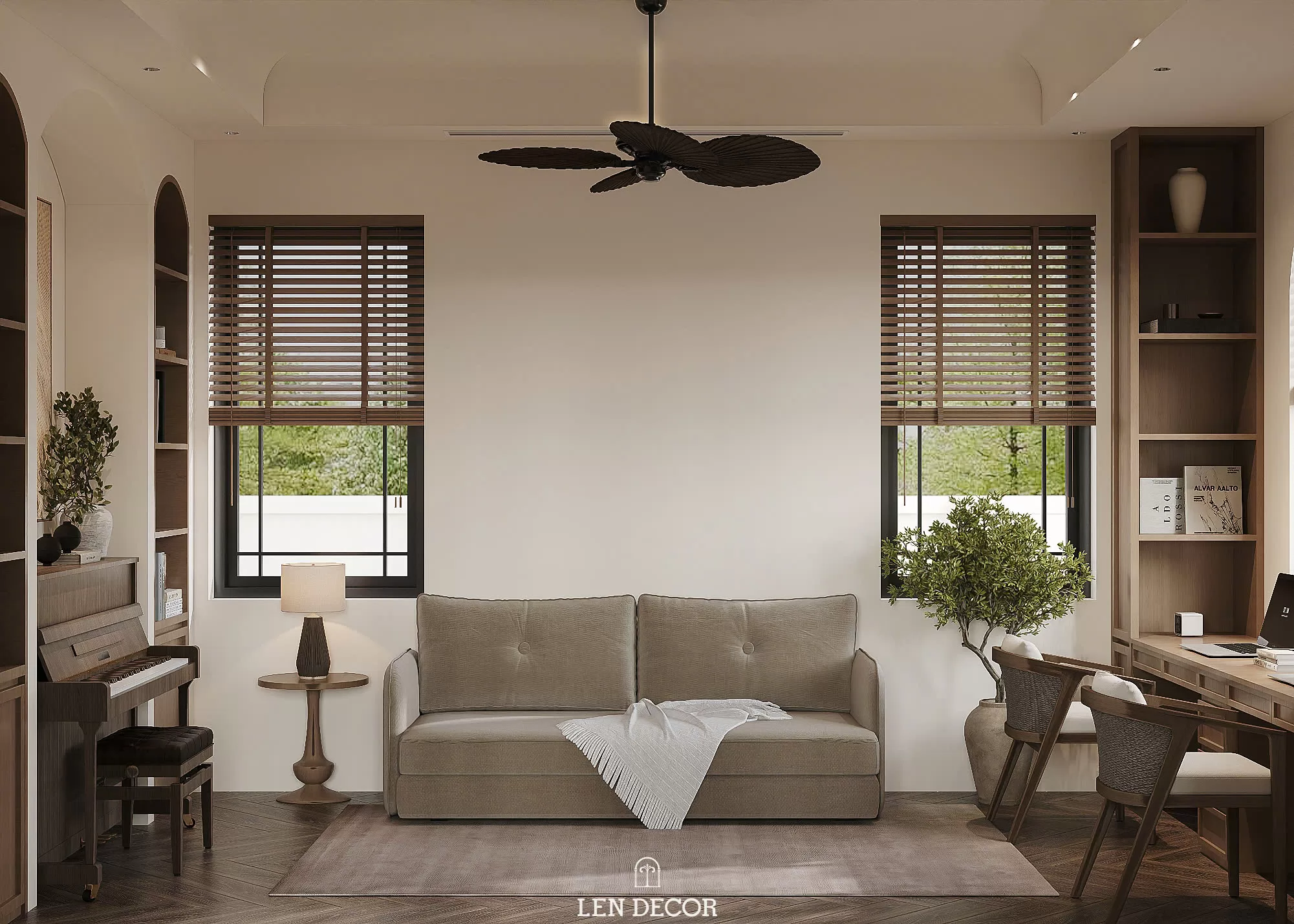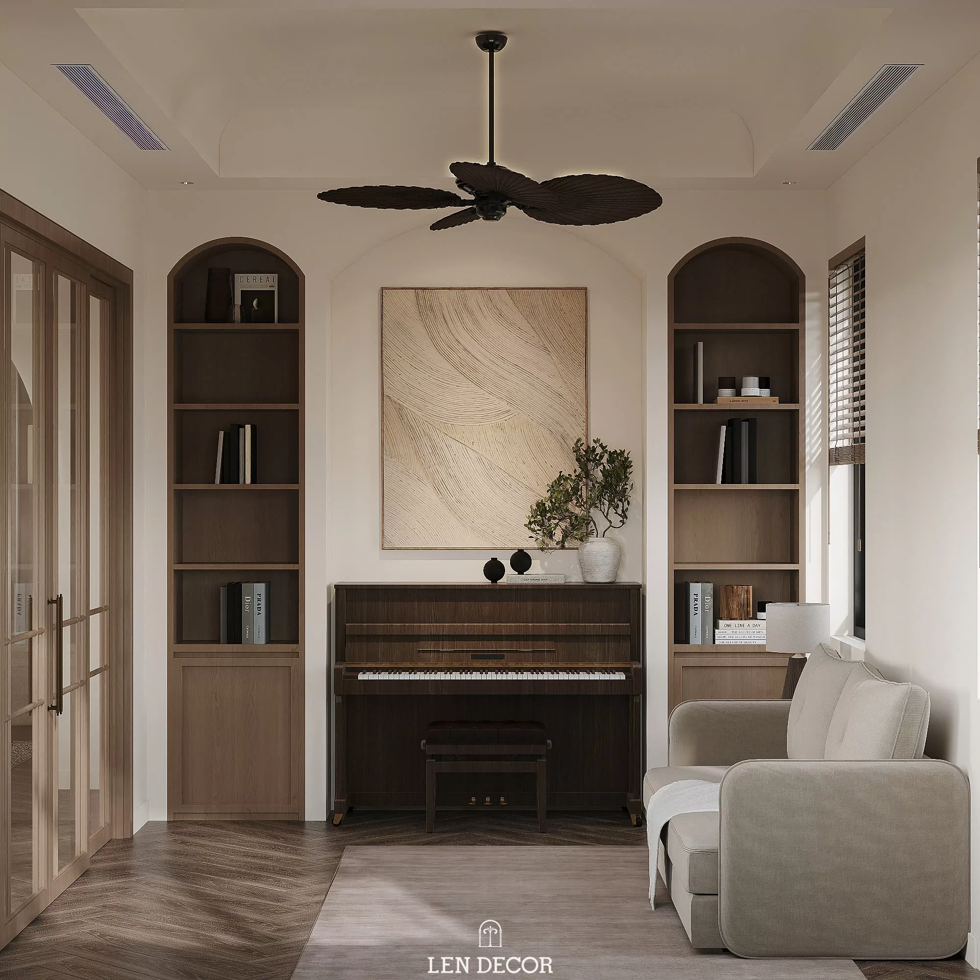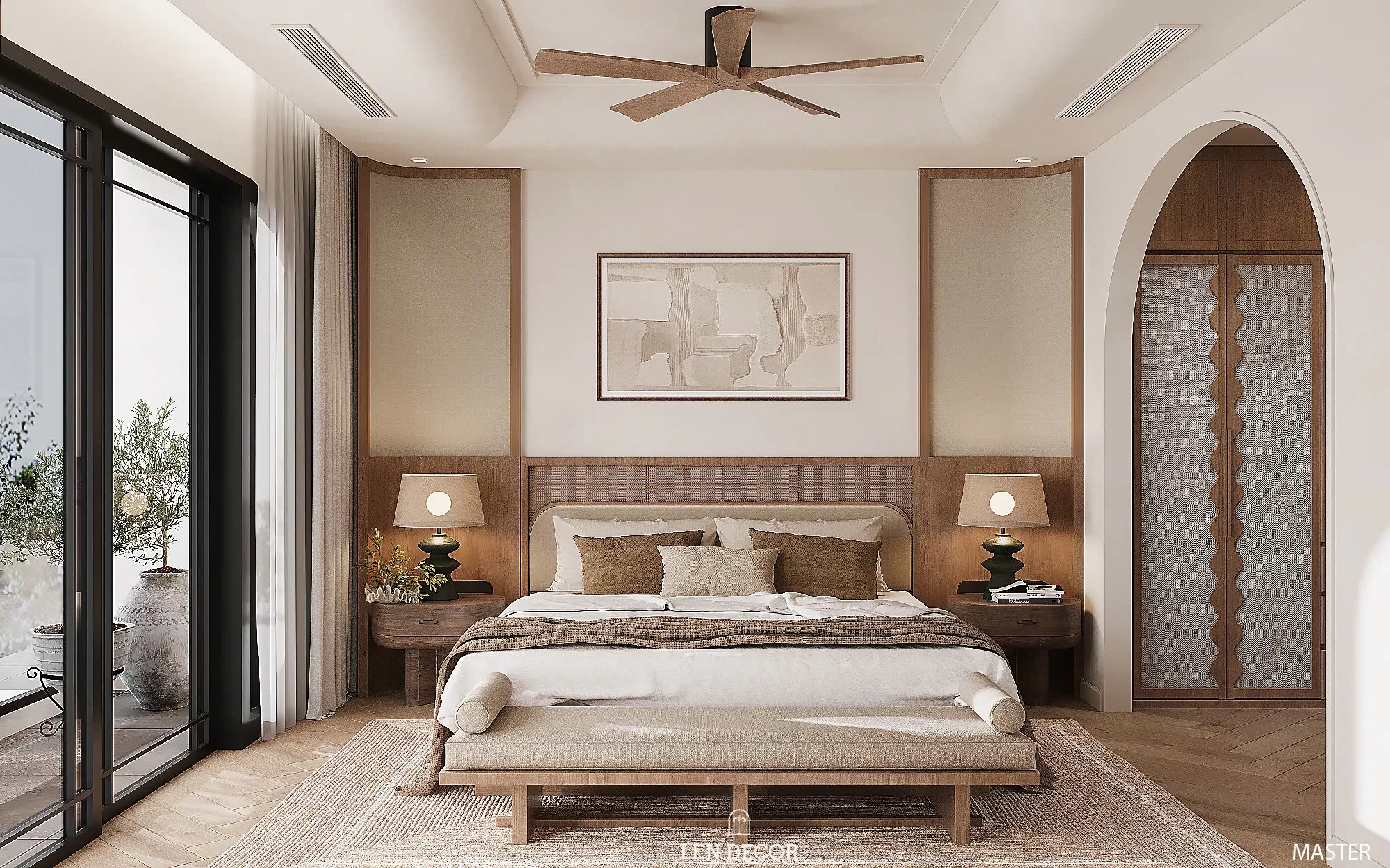 Không gian được tinh giản các chi tiết trang trí, kết hợp với những ô cửa vòm và đường nét thanh mảnh tạo nên sự dễ chịu về mặt thị giác.