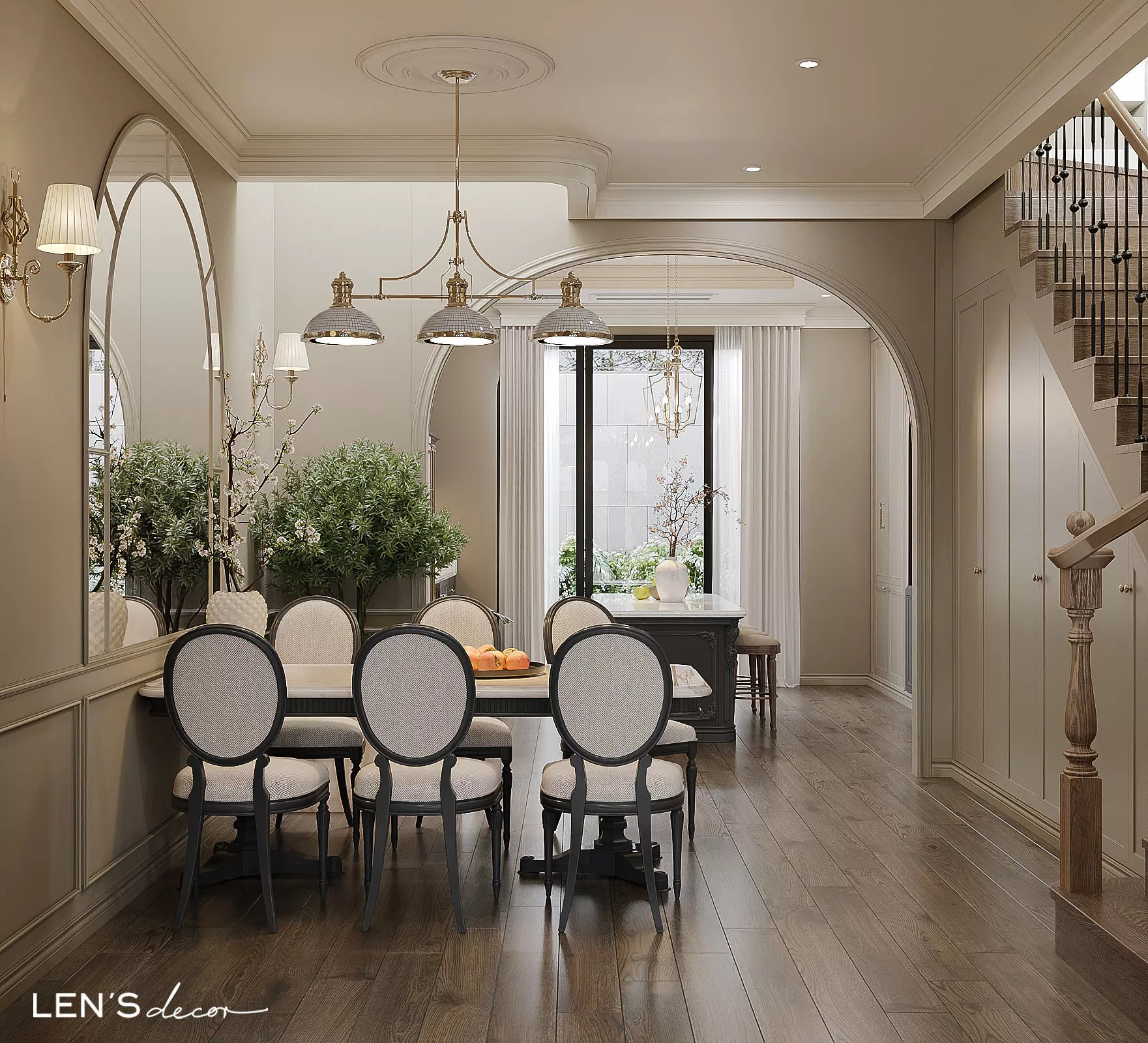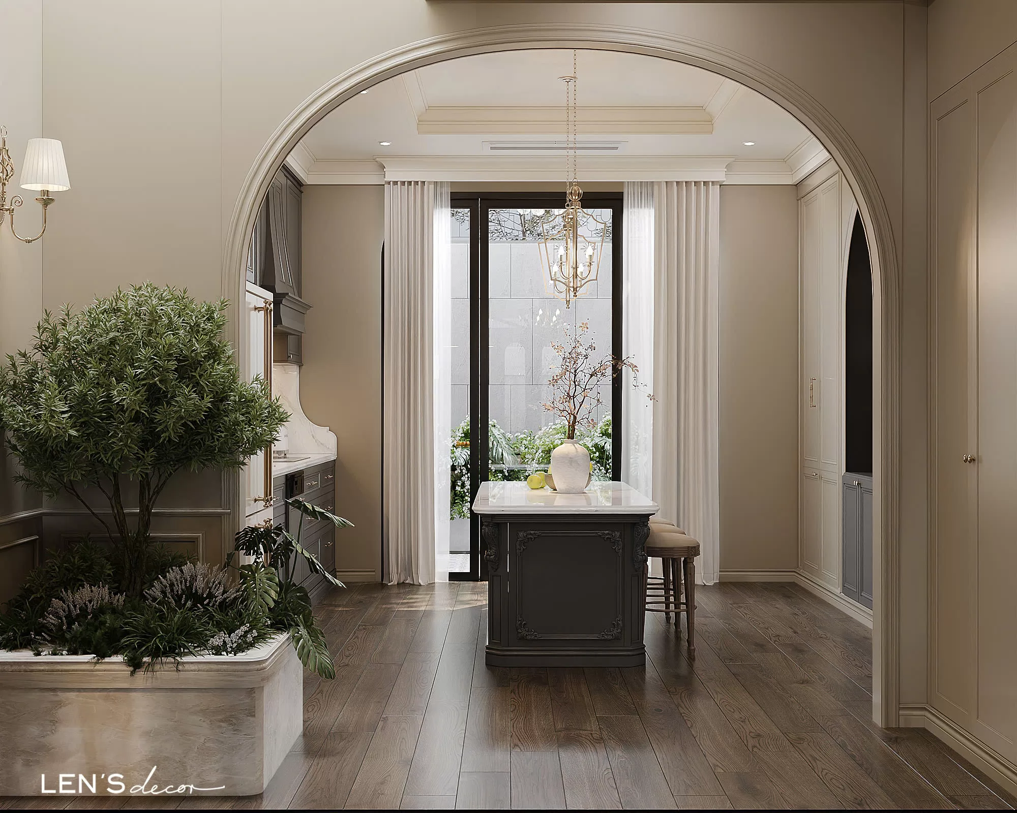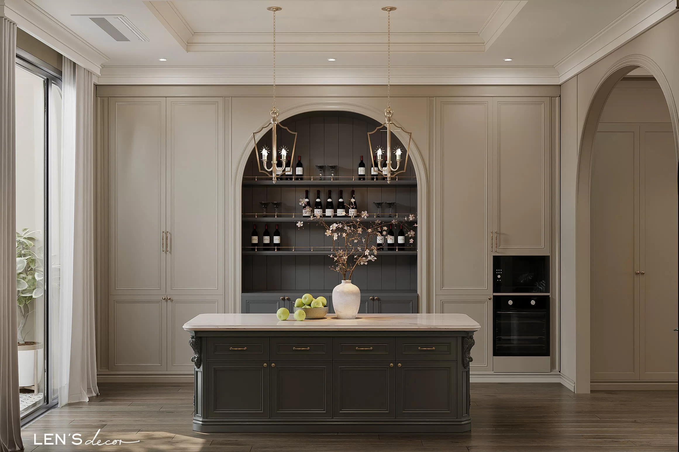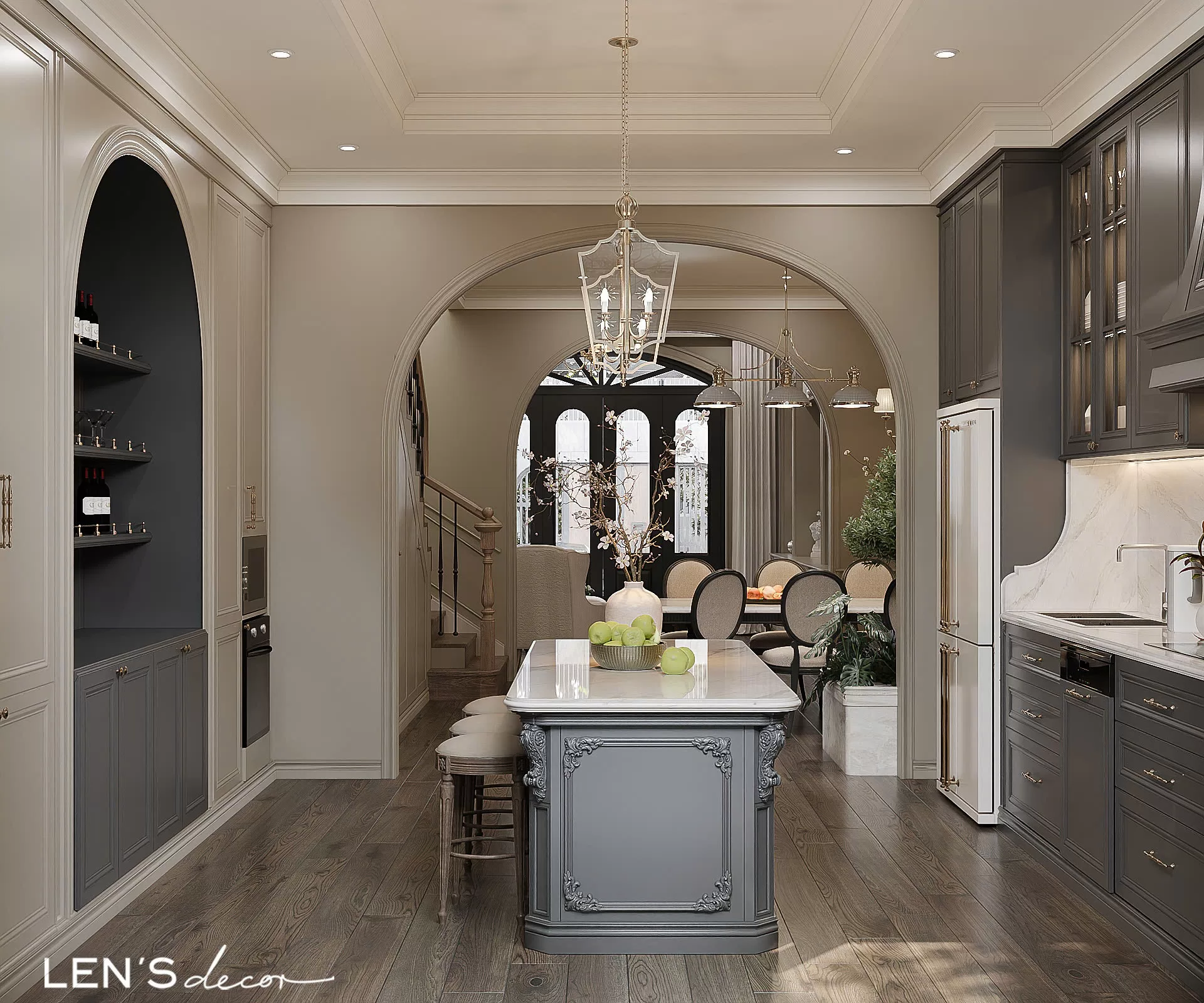 Tổng thể ấm cúng, chỉn chu và sang trọng nhờ sắc màu trung tính và những đường phào chỉ mềm mại. Điểm nhấn độc đáo chính là gian bếp tông xám với bàn đảo và tủ trưng bày tinh xảo, khơi gợi những bữa cơm đong đầy yêu thương.