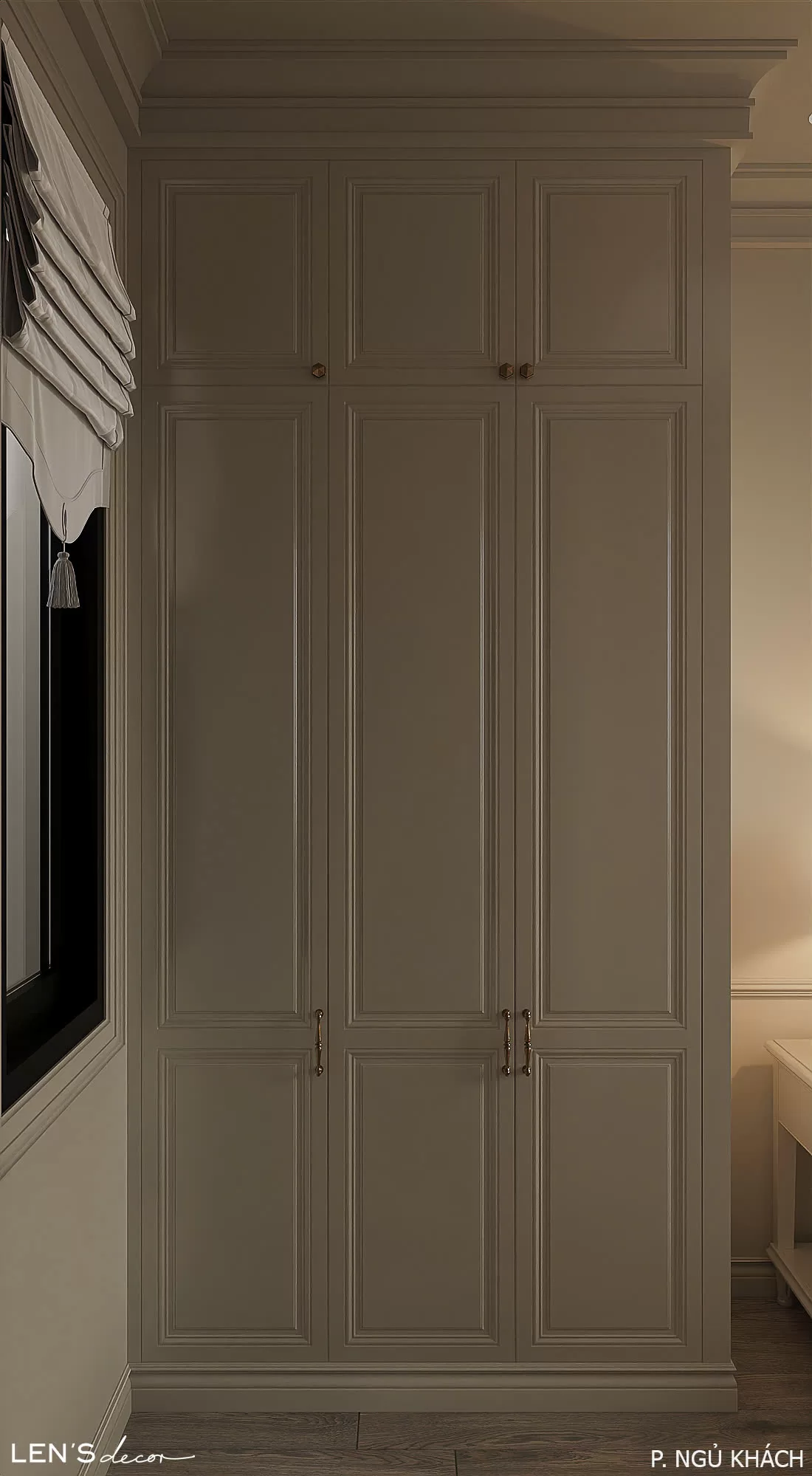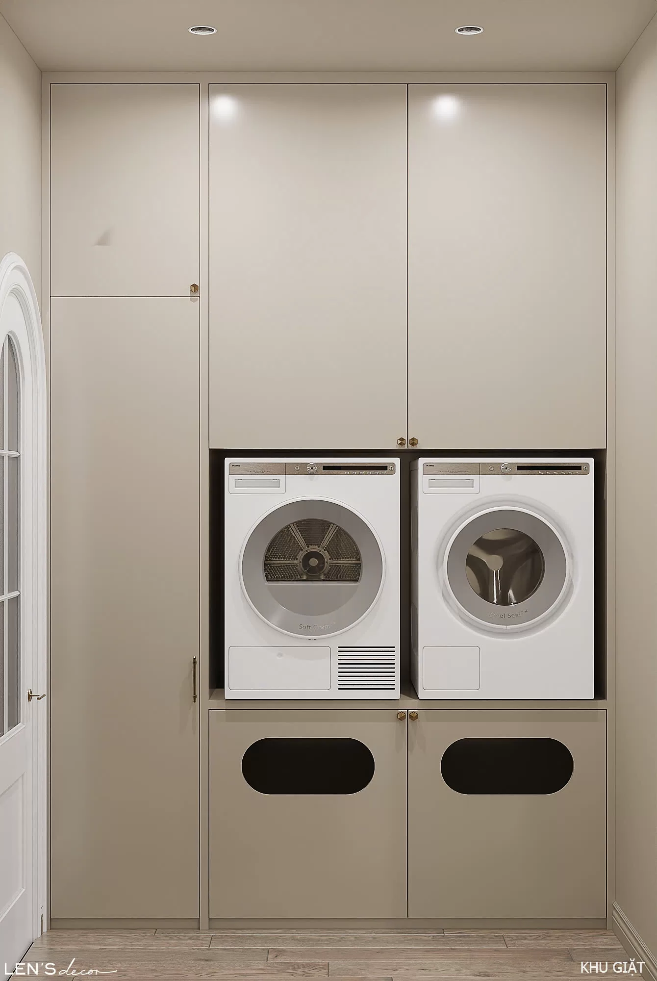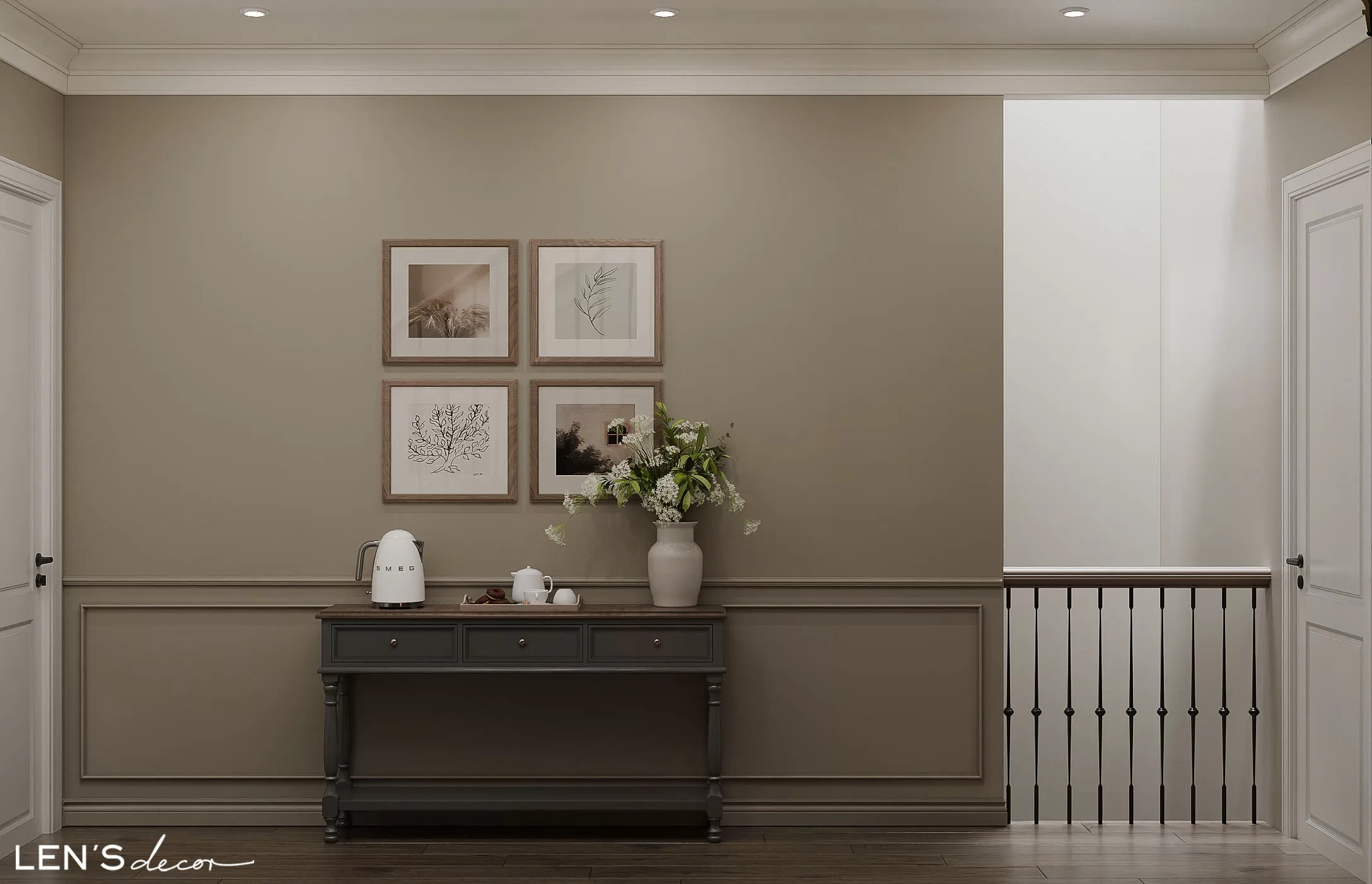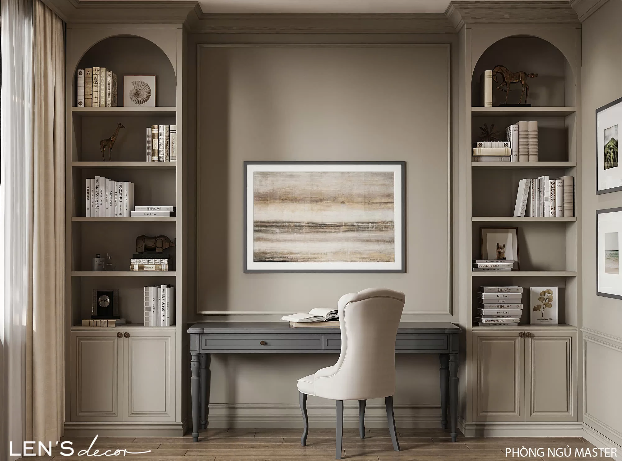 Tổng thể ấm cúng, chỉn chu và sang trọng nhờ sắc màu trung tính và những đường phào chỉ mềm mại. Điểm nhấn độc đáo chính là gian bếp tông xám với bàn đảo và tủ trưng bày tinh xảo, khơi gợi những bữa cơm đong đầy yêu thương.
