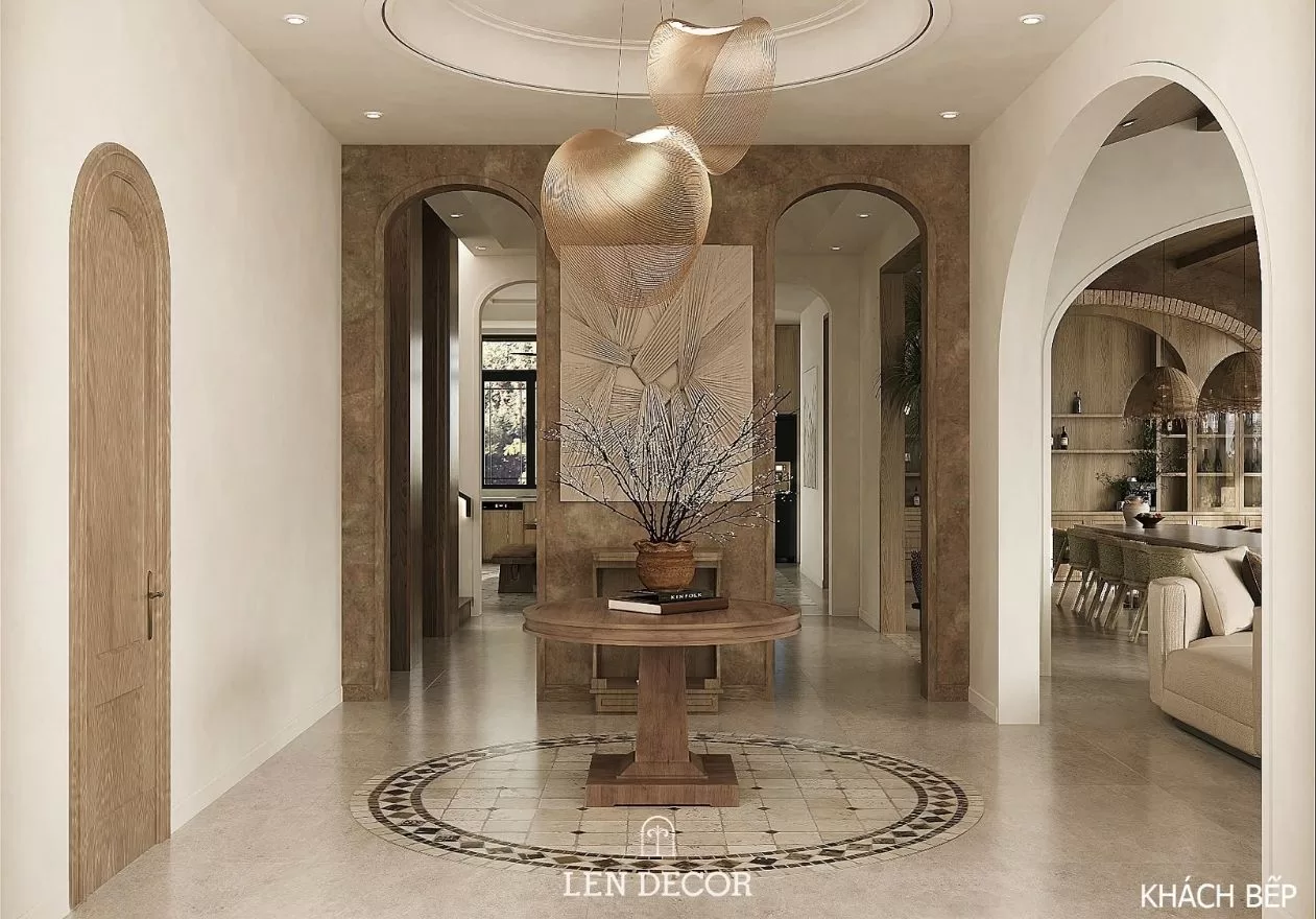 Villa Vũng Tàu mang dáng dấp của một ngôi nhà nghỉ dưỡng cao cấp, gợi nhắc vẻ đẹp thiên nhiên với sắc màu của cát, vân gỗ mộc mạc, tường đá và những đường cong mềm mại.
