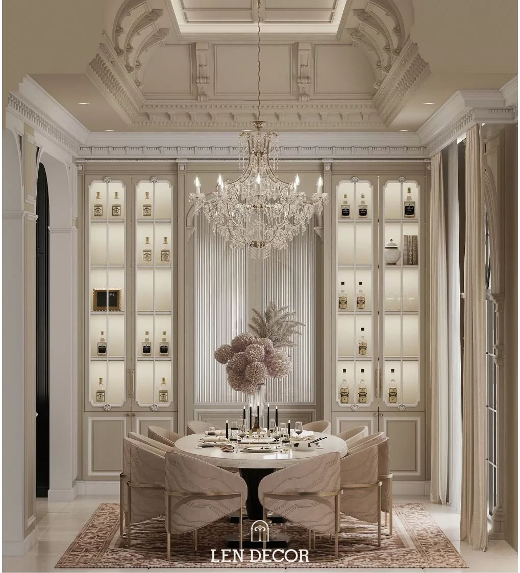 Từng sắc độ của kem và nâu trầm giao hòa với nhau, kết hợp ánh sáng từ đèn chùm pha lê phủ lên căn villa vẻ sang trọng, ấm áp và giàu tính nghệ thuật.