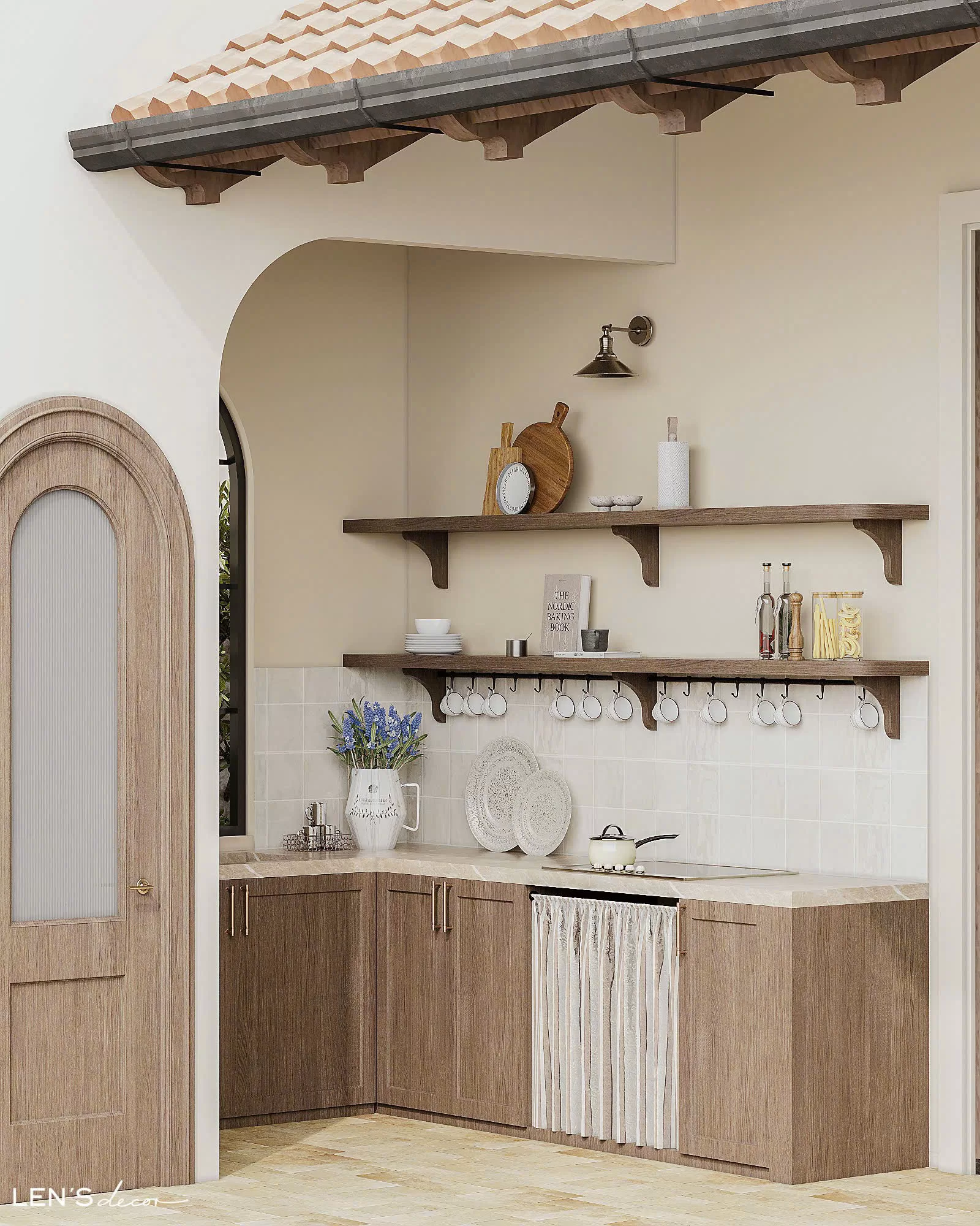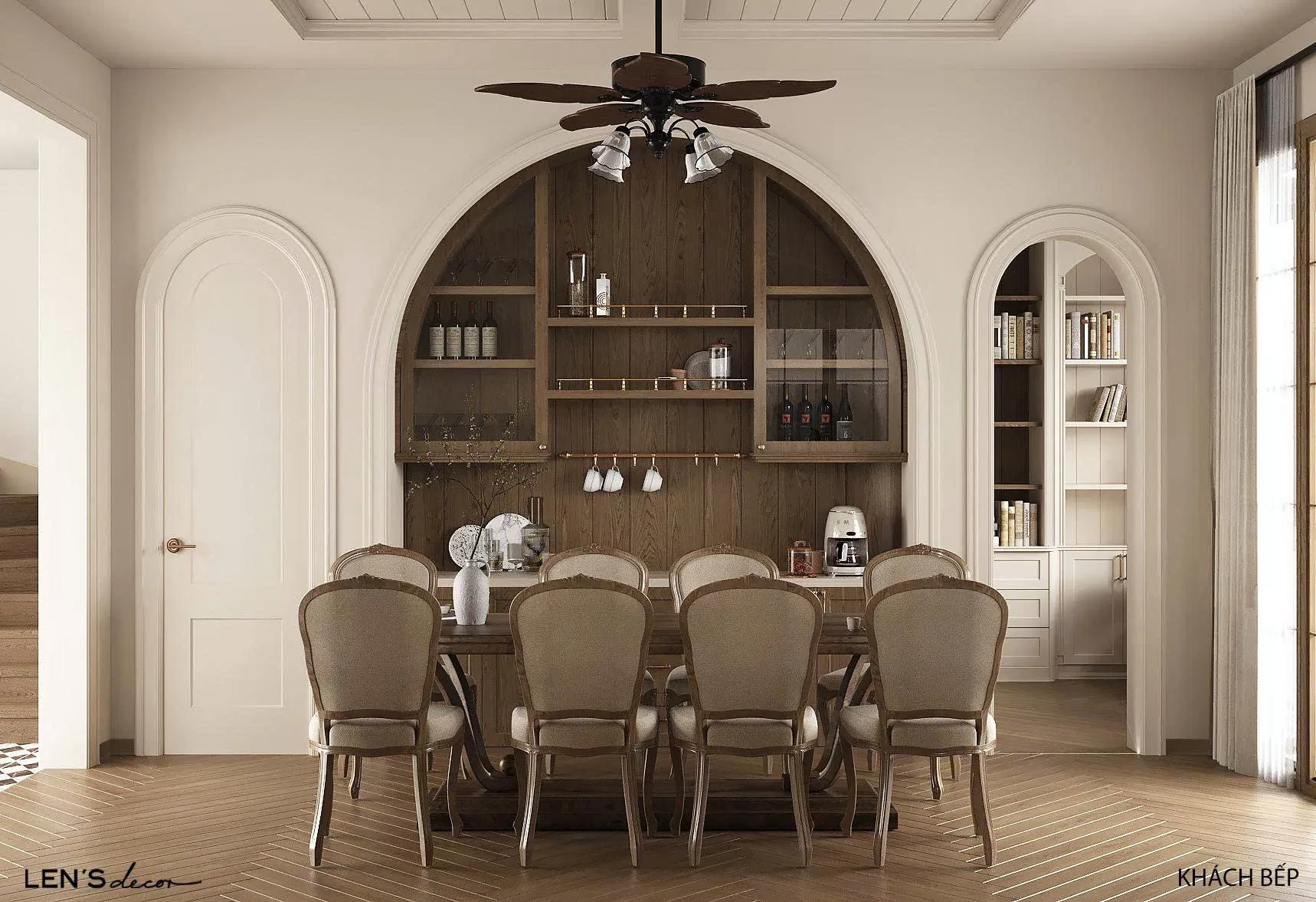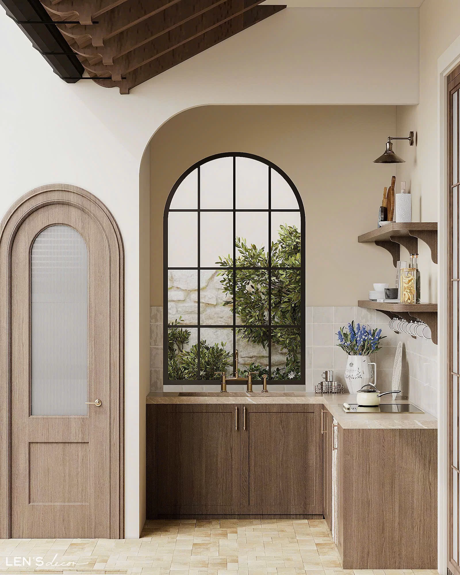 Bên trong, không gian nổi bật với những bức tường nâu đỏ, nội thất gỗ mộc mạc hay khung vòm ốp gạch thô. Từng chi tiết một được chăm chút, hòa quyện với nhau, vừa gợi cảm giác nghỉ dưỡng, vừa đảm bảo sự tiện nghi cho nhịp sống thường ngày.