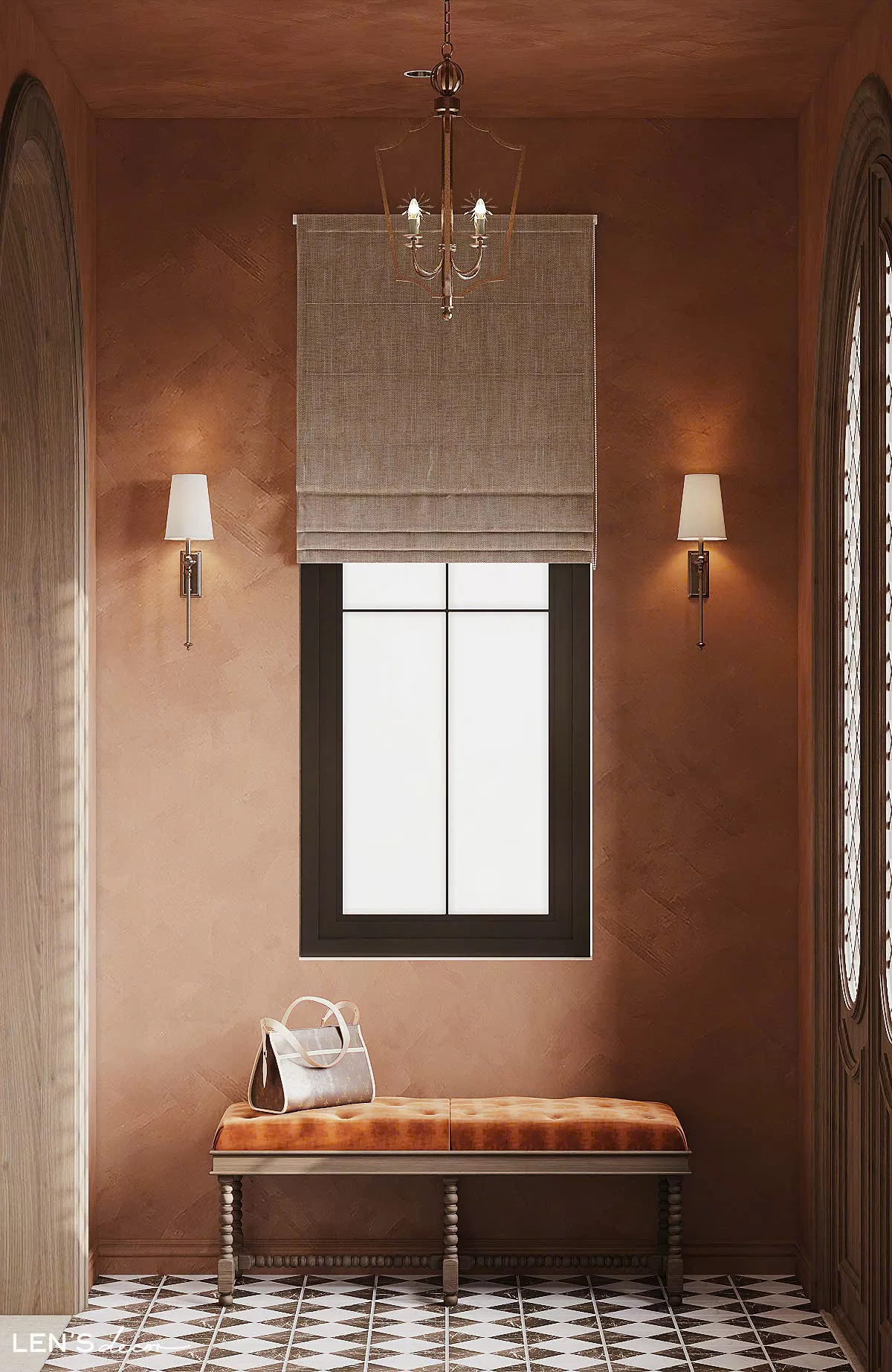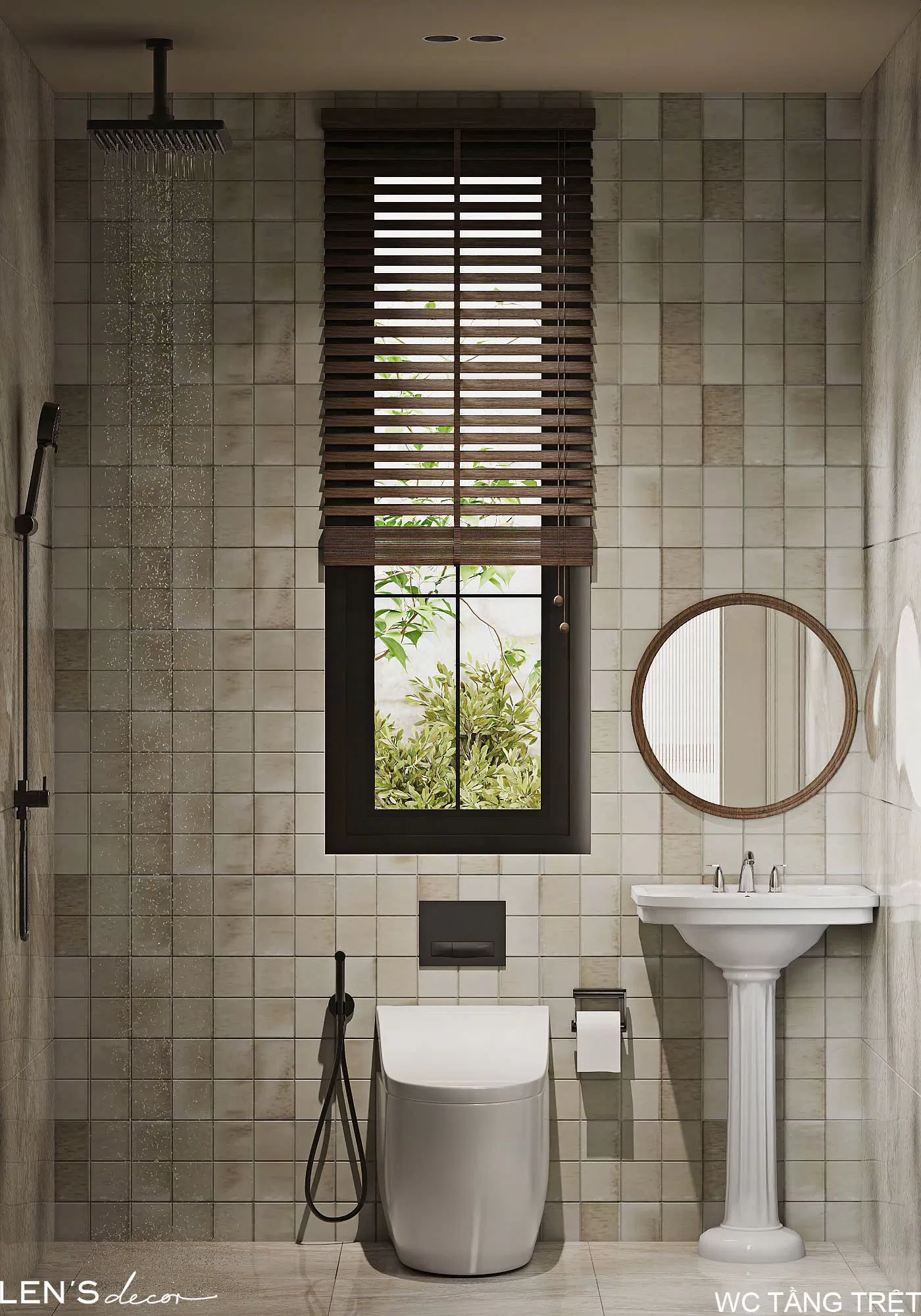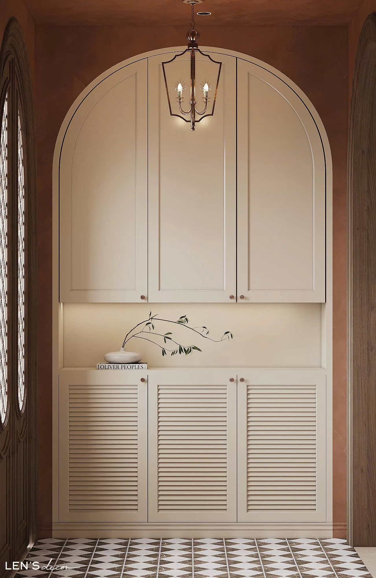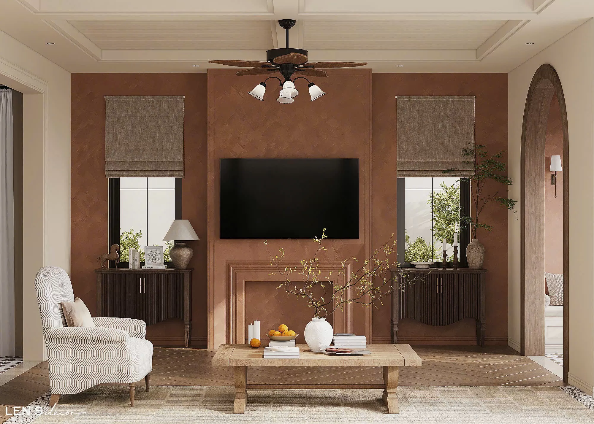 Bên trong, không gian nổi bật với những bức tường nâu đỏ, nội thất gỗ mộc mạc hay khung vòm ốp gạch thô. Từng chi tiết một được chăm chút, hòa quyện với nhau, vừa gợi cảm giác nghỉ dưỡng, vừa đảm bảo sự tiện nghi cho nhịp sống thường ngày.